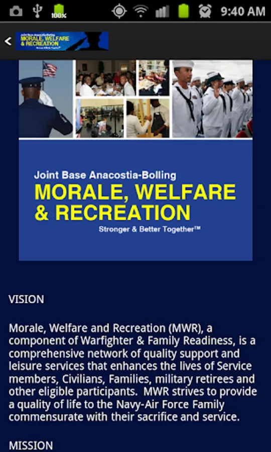 MWR ABSalute is a fast and easy-to-use application designed for our military members and their families, retirees, DoD civilians, and contractors to quickly access events and programs while on the go. Get the latest information about Morale, Welfare and Recreation programs, as well as Warfighter and Family Readiness programs offered at Joint Base Anacostia-Bolling (JBAB). Our MWR mission is to foster and support high productivity for our Navy-Air Force audience through mental and physical fitness, personal growth, a sense of community, positive values and family well-being.