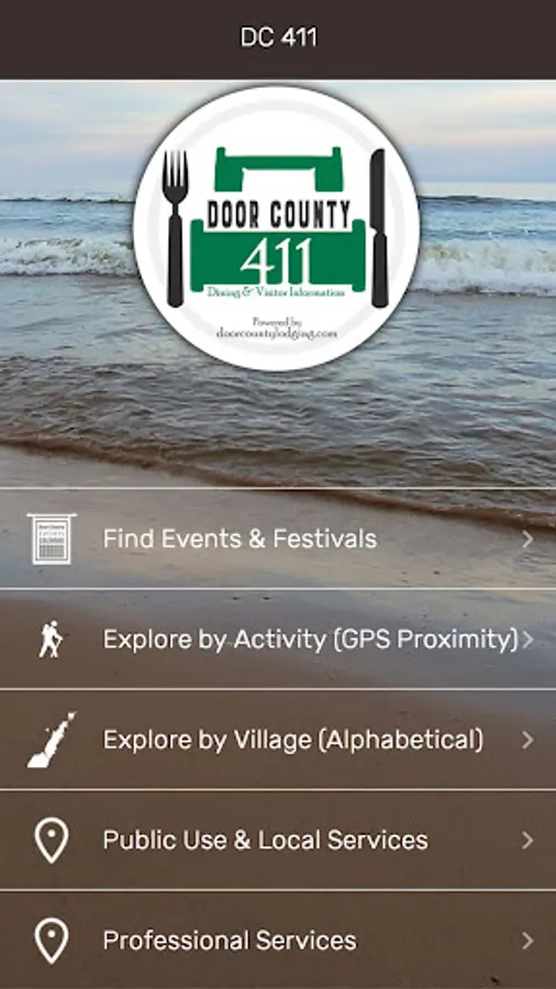 Make your search for Door County dining & visitor information easier! The Door County 411 mobile app (formerly Door County Chefs mobile dining app) allows you to search for restaurants, activities, and information on the peninsula by category and location. View our all-inclusive and continuously expanding list of dining establishments to see online menus and use ordering links, use our click-to-call feature to order take-out or to make reservations, and get GPS navigation from your current location.