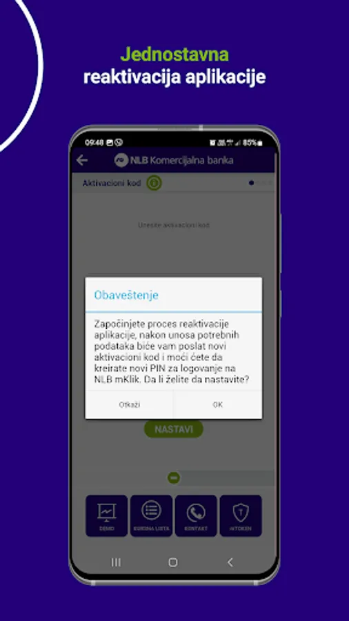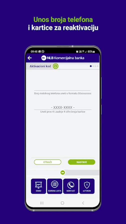 Note: Registered accounts for NLB mKlik application can be activated or reactivated from the app. Clicking on the option „New activation code“ (on the login page) and entering the first and last four digits of any active payment cards, along with mobile phone number registered for mobile banking service will inititate sending of activation codes via SMS. Sending of activation codes can also be initiated from eKlik application or by calling Contact Centre.