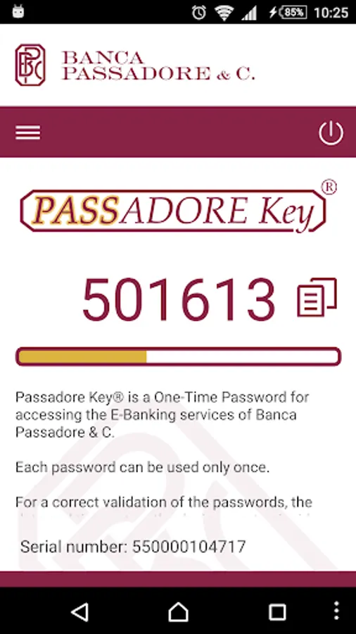 Passadore Key app allows, in the context of the exclusive "PASSADORE Key®" strong authentication system, to use either a tablet or a smartphone device for the generation of “One-Time Passwords”, required both for accessing and confirming transactions within Banca Passadore’s "IB - Internet Banking" and "MB - Mobile Banking" Services.