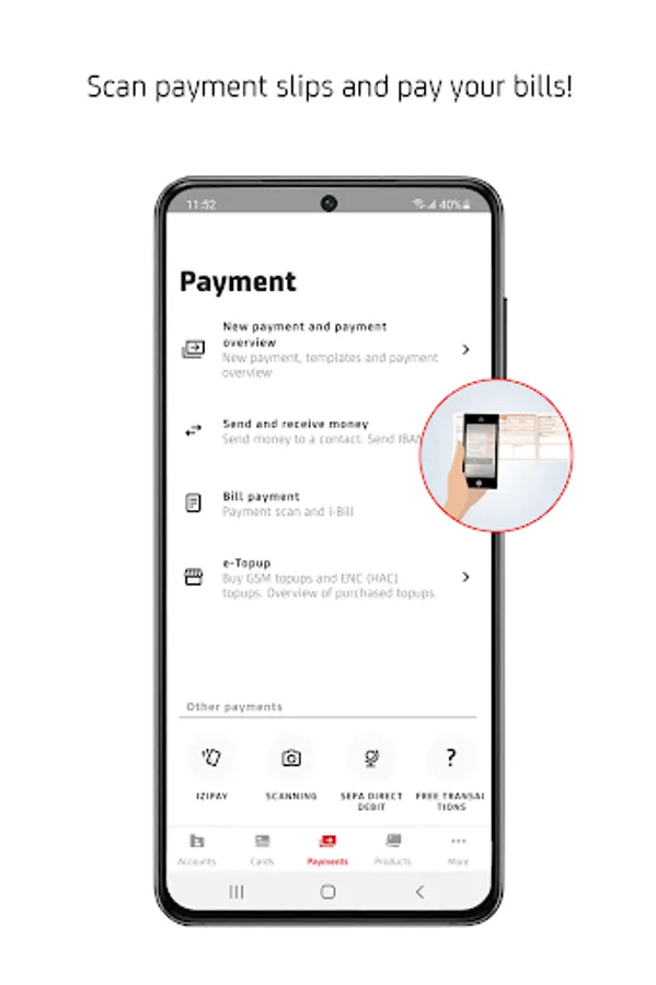 • Pay your bills by scanning via the m-photo pay or the fast scan services.