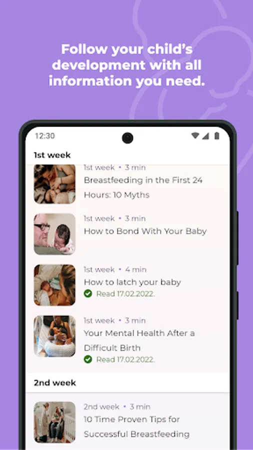 Informative articles on topics depending on your child’s age, at first appearing every week, and later every month.