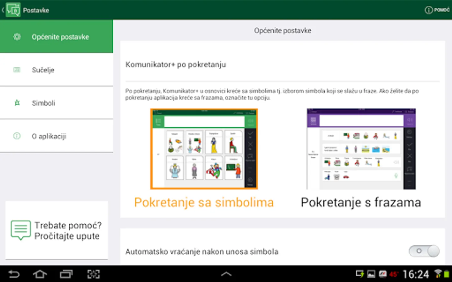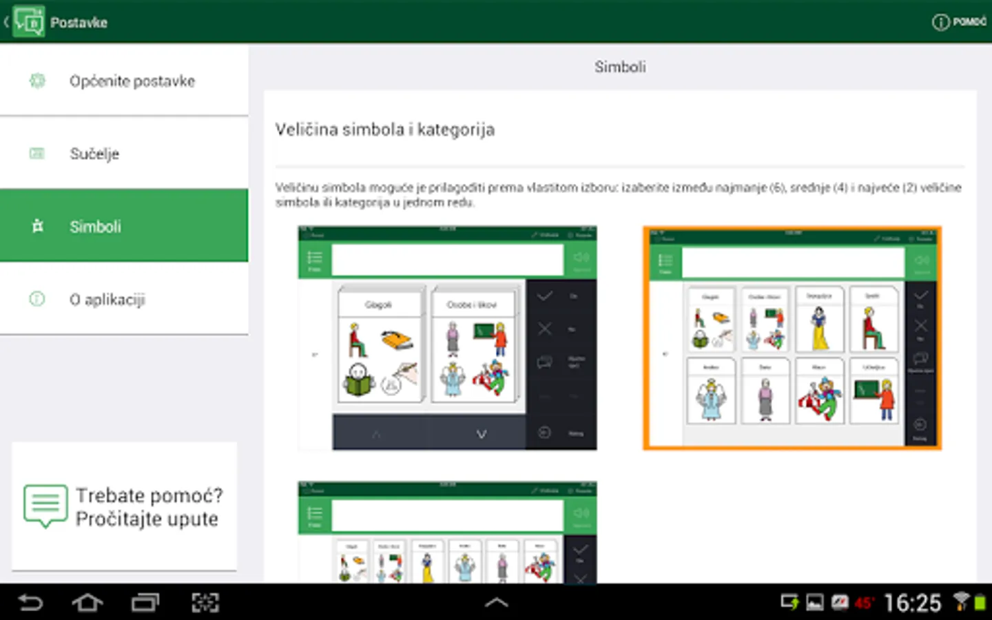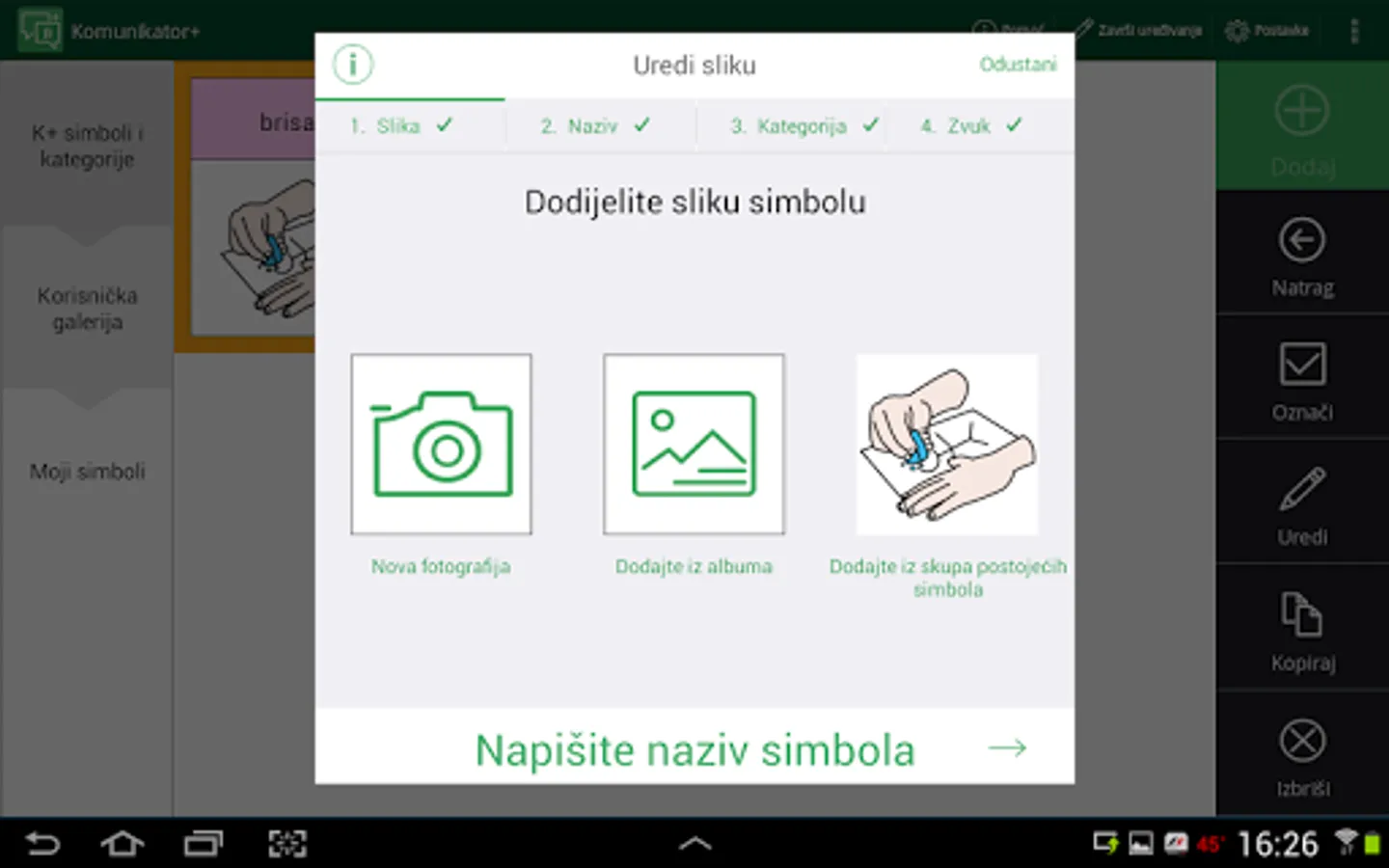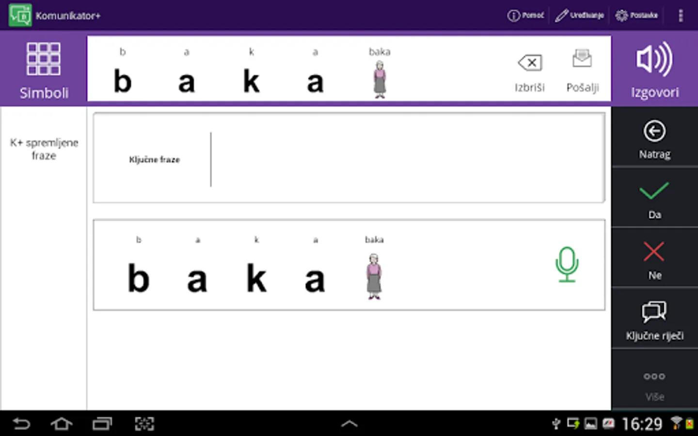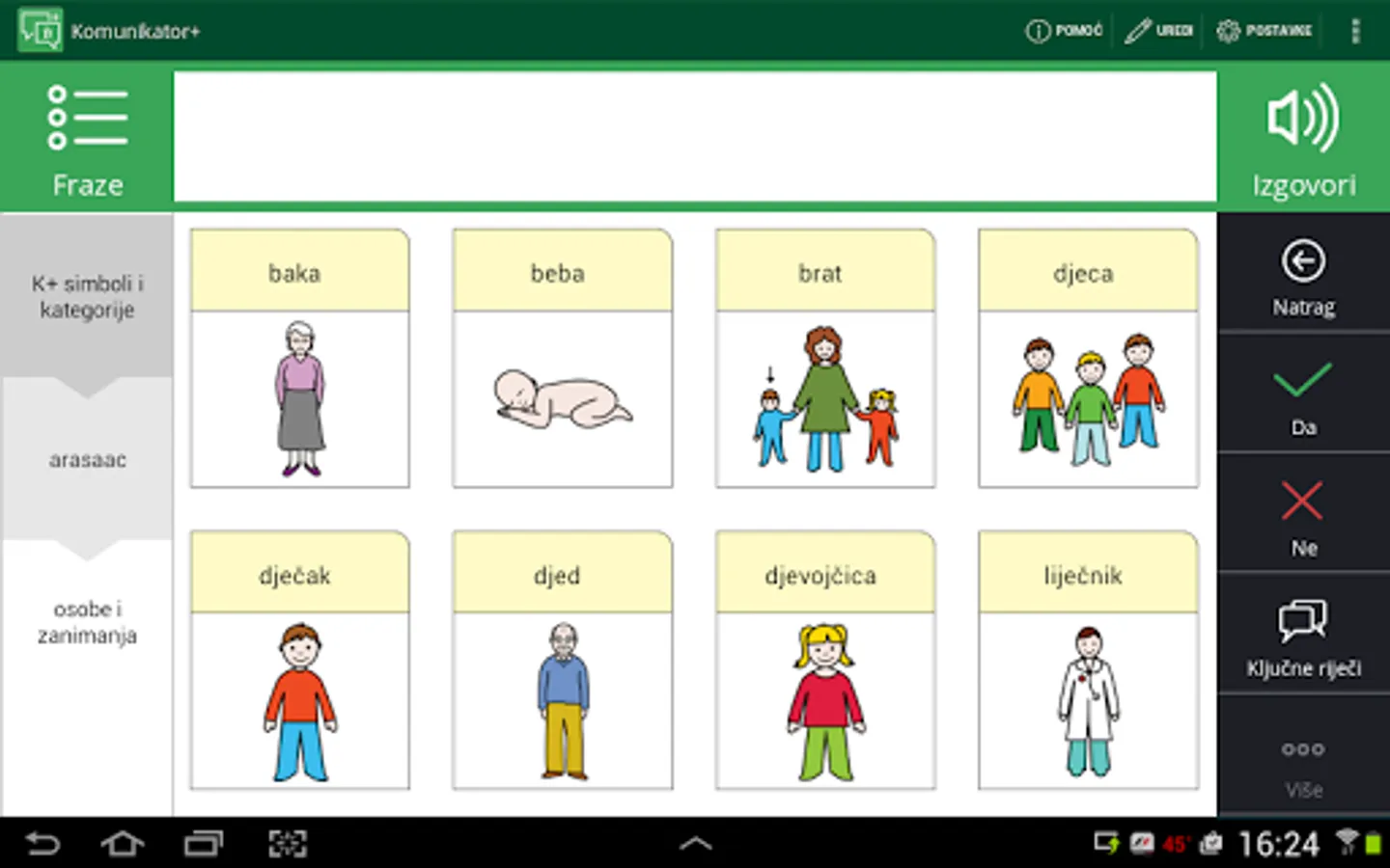 Application of ICT-AAC + Communicator allows stacking of phrases and sentences using symbols that can be integrated photos taken with the device camera, pictures in the gallery device or symbols from the three non-commercial galleries (ARAASAC, Mulberry and Sclera). Using the intuitive user interface the user finds the desired symbol and clicking on its image recording adds it to the toolbar intended to display the current phrase.
