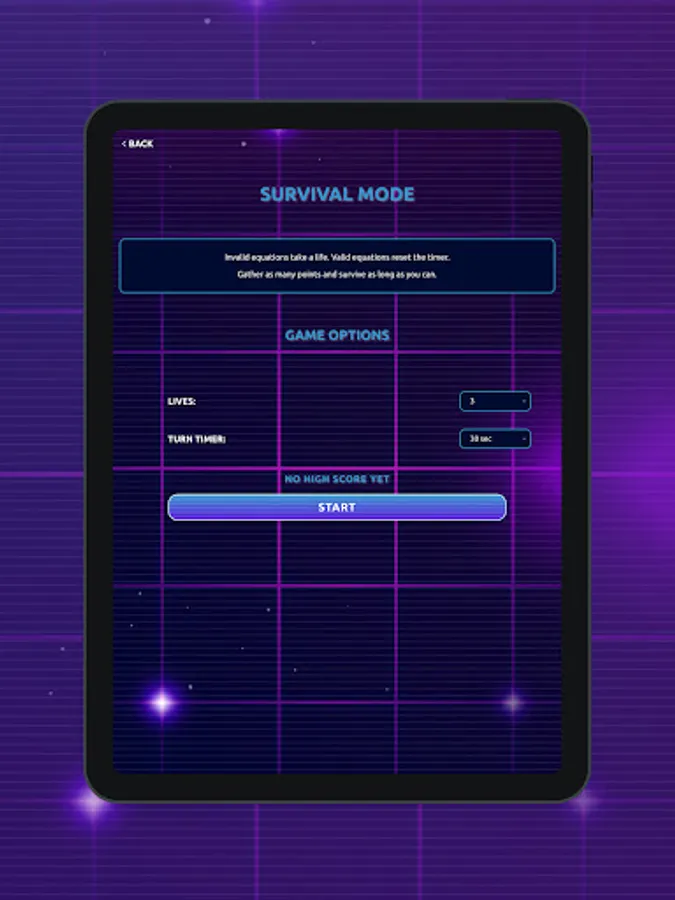 Invalid equations take a life. Valid equations reset the timer. Gather as many points and survive as long as you can.