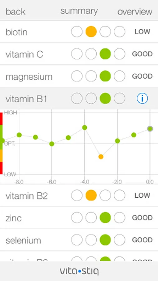 Vitastiq app guides you through every step while you are taking your vitamin and mineral readings. It helps indicate whether your general nutrient trend is low, high or just right.