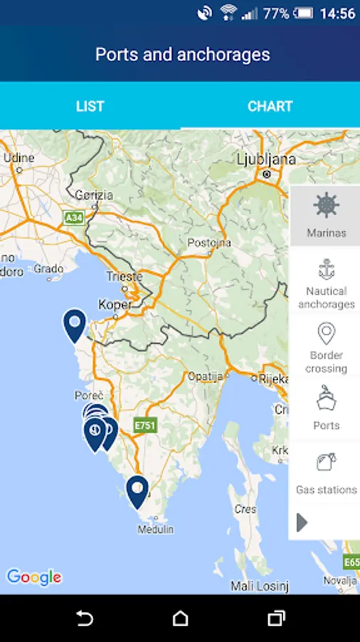 • ports and anchorages (marines, nautical anchorages, petrol stations, border crossings)