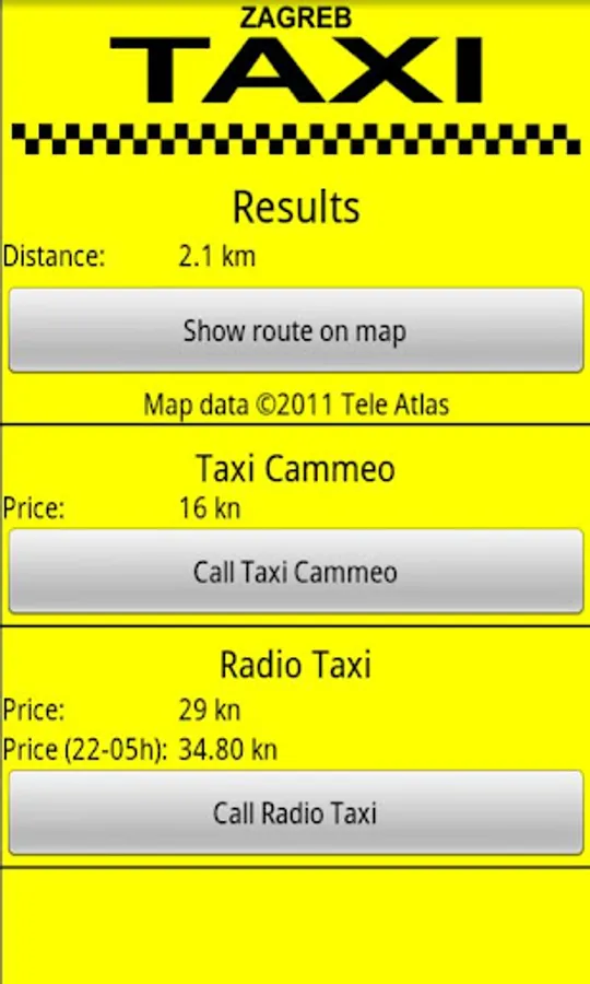 Type in your current address (or let the application find it) and destination address, and the application will calculate for you prices for the route for taxi companies in Zagreb.