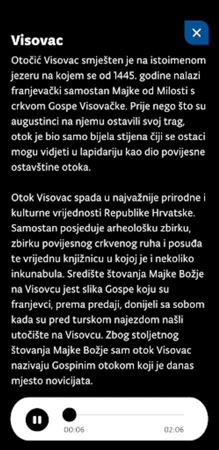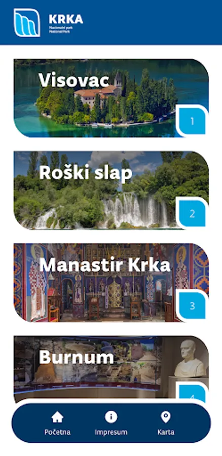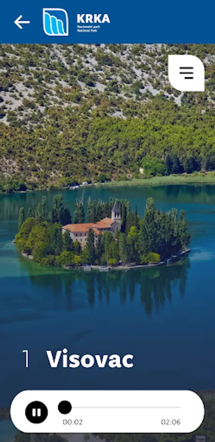 The audio guide contains four themes for the audio guidance at four locations in Krka National Park: islet of Visovac, Roški waterfall, Krka monastery and Burnum archaeological site