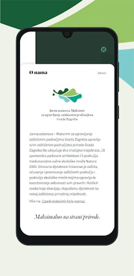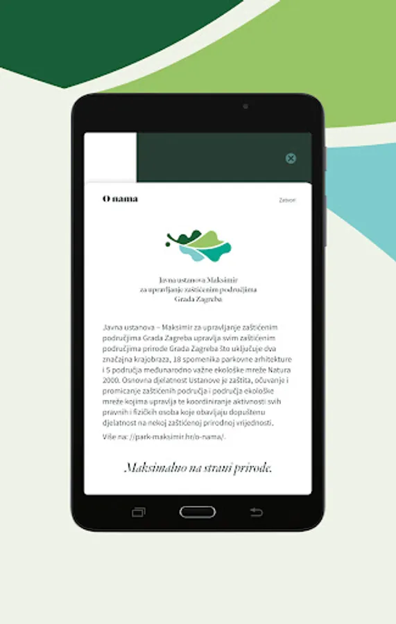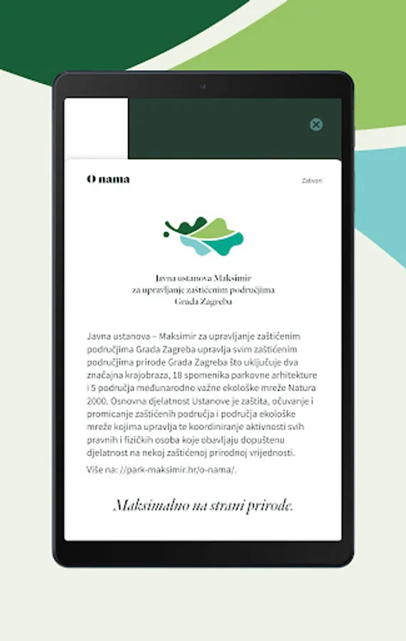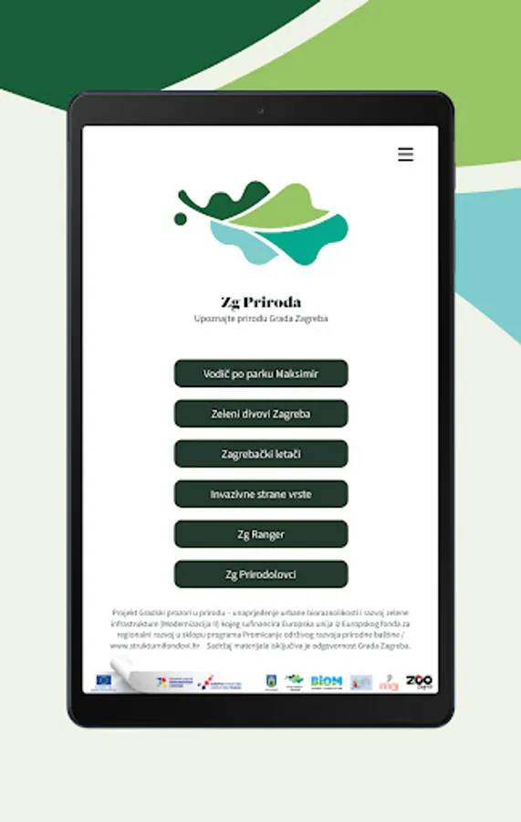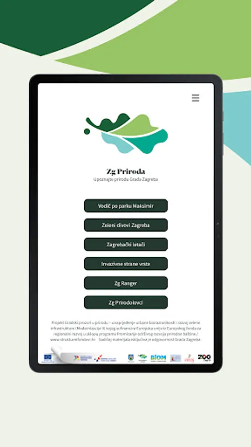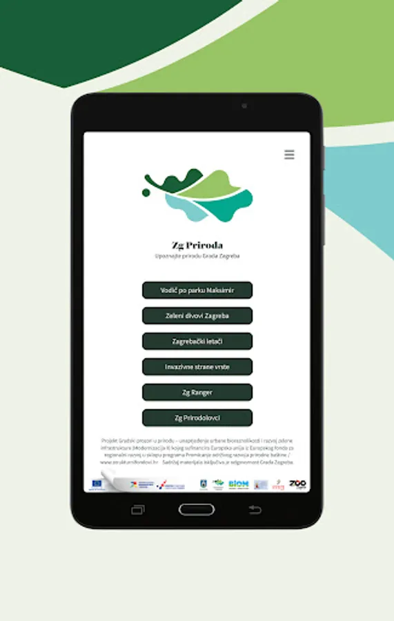 The Zg Priroda application was created with the aim of educating individuals about the nature of the City of Zagreb and communication of individuals with the Institution, encouraging spending time in nature, raising visitors' awareness of nature protection, processing biological components, and contributing to the collection of data essential for nature protection. It consists of applications: Maksimir Park Guide, Green Giants of the City of Zagreb, Zagreb Flyers, Invasive Foreign Species, Zg Ranger and Zg Naturalists.