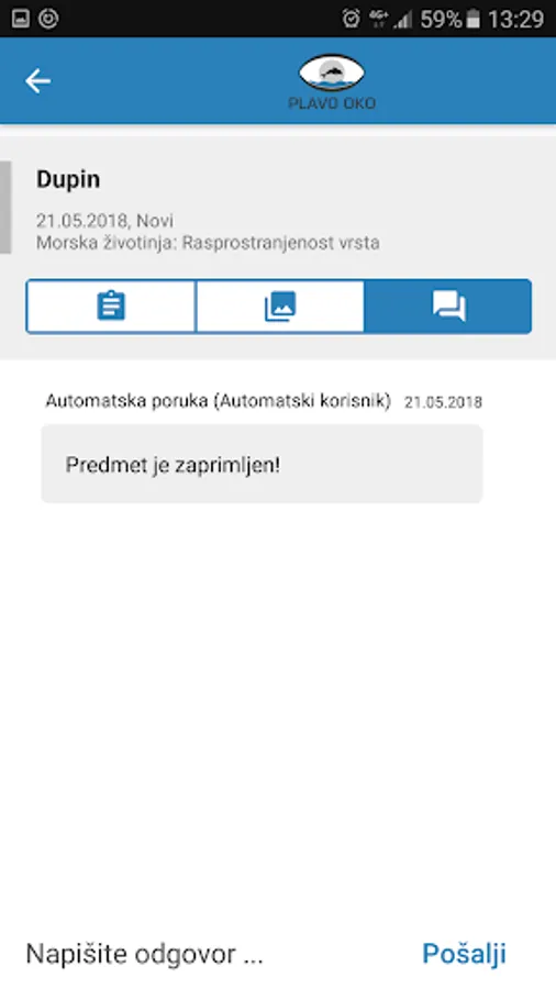 By logging in to the Blue Eye application and filling in your data, you will receive, as soon as possible, information about your observation of nature, an unusual event, or recorded species on the seashore, in or on the surface of the sea. At the same time, with the data recorded, experts get useful information that serves them in further research and in properly informing the public on the recorded species.