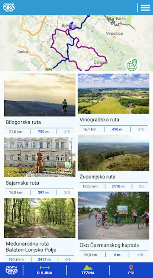 Bjelovarsko Bilogorska Bike Routes brings together the official cycling routes of Bjelovarsko-Bilogorska County. The app's overview provides a simple way to select the most suitable route on the map or via the map view.