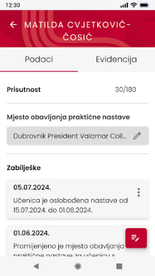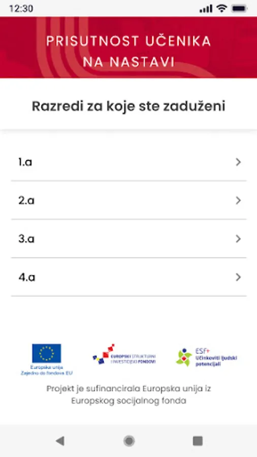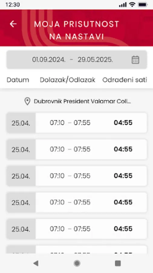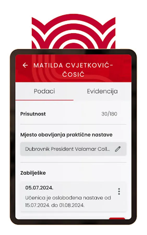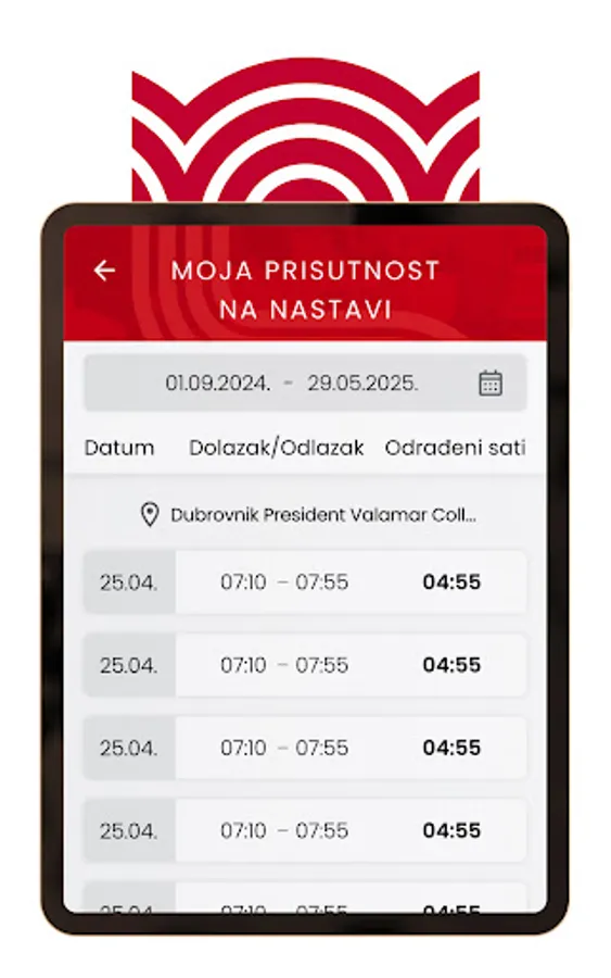 The mobile application is a digital system for recording the attendance of students of the Dubrovnik School of Tourism and Hospitality at practical classes, created for the needs of the project "Establishment of the Dubrovnik Regional Center of Competence in Tourism and Hospitality". The application is intended for teachers and students to make it easier for them to record their attendance at classes. The record begins by touching the mobile device to the contactless chip located in the facility where practical classes are held, during which the mobile application is activated. Students have access to their current and previous attendance records, while teachers within the application have insight into the classes and students they are in charge of, as well as an overview of all their records. Teachers also have the option of changing the place of practical teaching for an individual student, as well as adding a note.