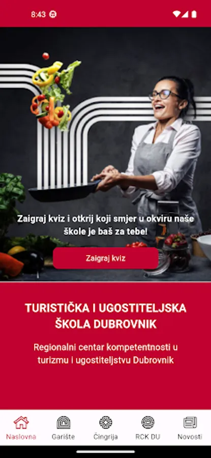 The RCK DU mobile application allows you to quickly and easily access information from three different sources - Garište Academy, Čingrija and RCK DU itself. This app is your one-stop guide to the latest information and news. At the very beginning, you can choose the categories of news that you want to view within the application. For each new news from the category you selected, you will receive a notification (if you agree that the mobile application sends you news). Another additional functionality of this application is the quiz. Play the quiz, answer a few questions so that at the end of the quiz you will get an answer as to which specialization of the Dubrovnik Tourism and Hospitality School is your direction for further education.