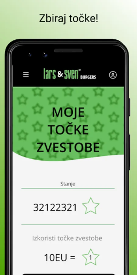 USAGE: The user of the loyalty program has the right to collect and use Lars & Sven points by submitting a unique user code identification code before submitting an order to Lars & Sven staff in all Lars & Sven Burgers units in Slovenia. For every $ 10 spent on purchasing products from the Lars & Sven Burgers offer, according to the regular scale of prize points, the user is entitled to one (1) point Lars & Sven