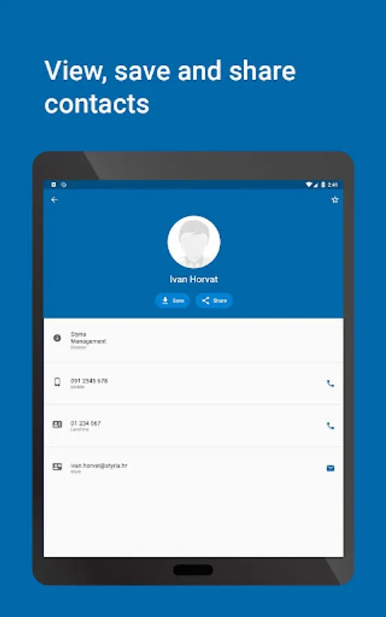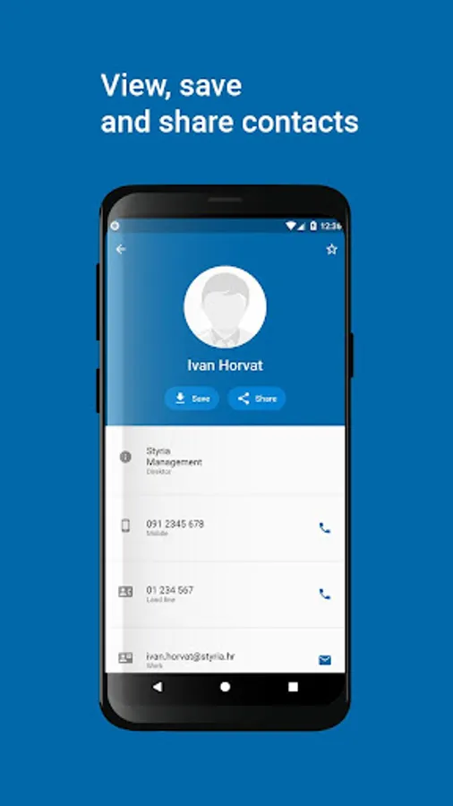 The application allows employees of Croatian companies owned by Styria Media International GbmH to search by name, number and function; employee lists by company and department; saving contacts but also direct calling and emailing.