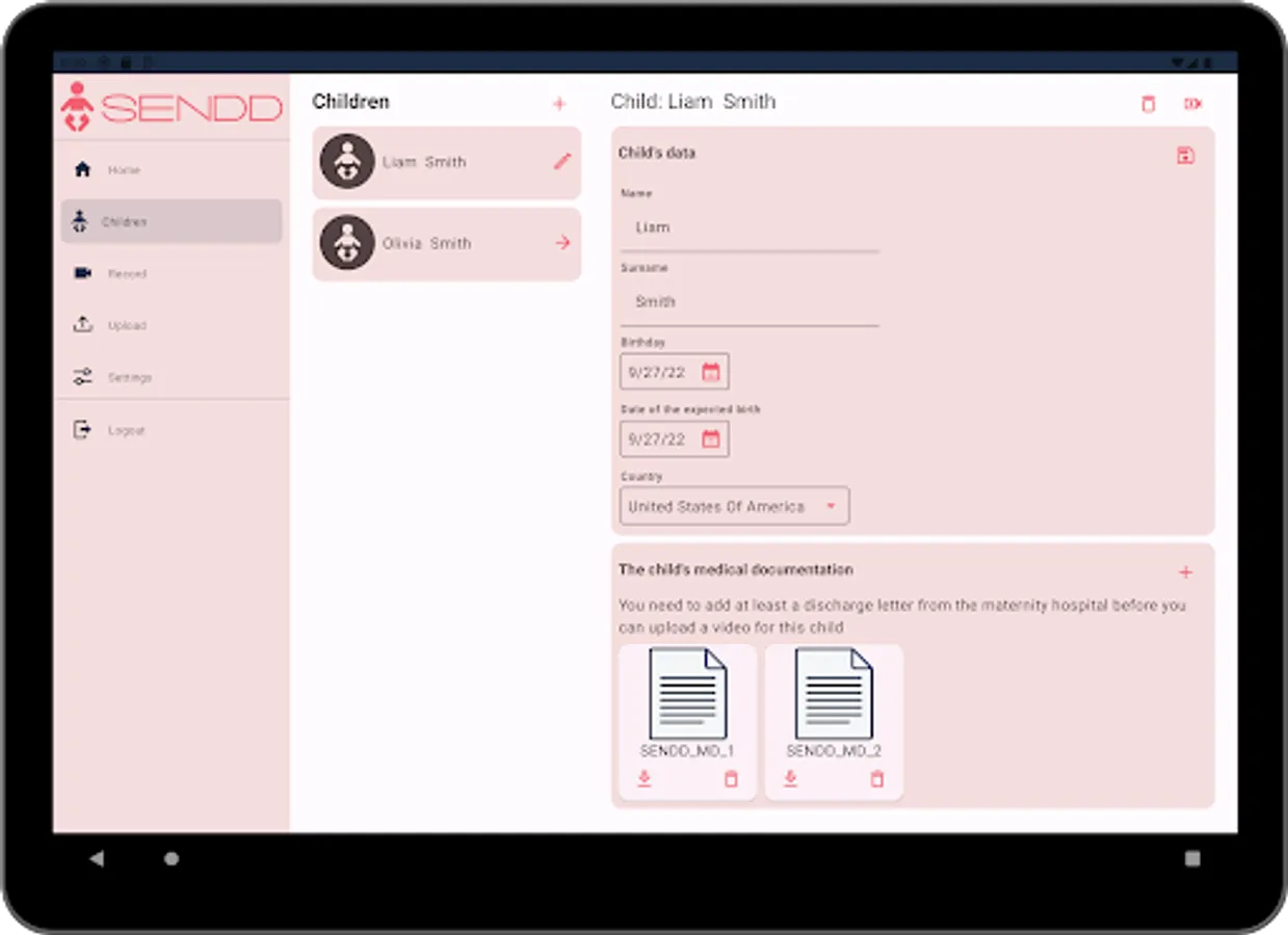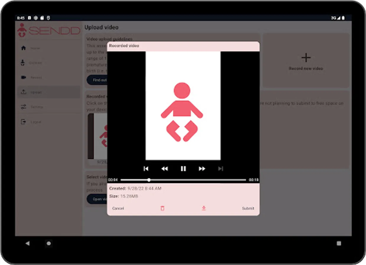 The system is based on artificial intelligence technology, more precisely computer vision for recognizing children's poses, and trained neural networks for concluding the quality of movement, that follow medically proven method and classification of spontaneous movement quality assessment according to prof. M. Hadders-Algra, MD, PhD. The project is also open to the public and can be accessed by all interested parents of children aged 1.5 to 3.5 months with the voluntary provision of a video of the child's fidgeting to assess the quality of spontaneous movements. More details about the project can be found at www.sendd.eu.
