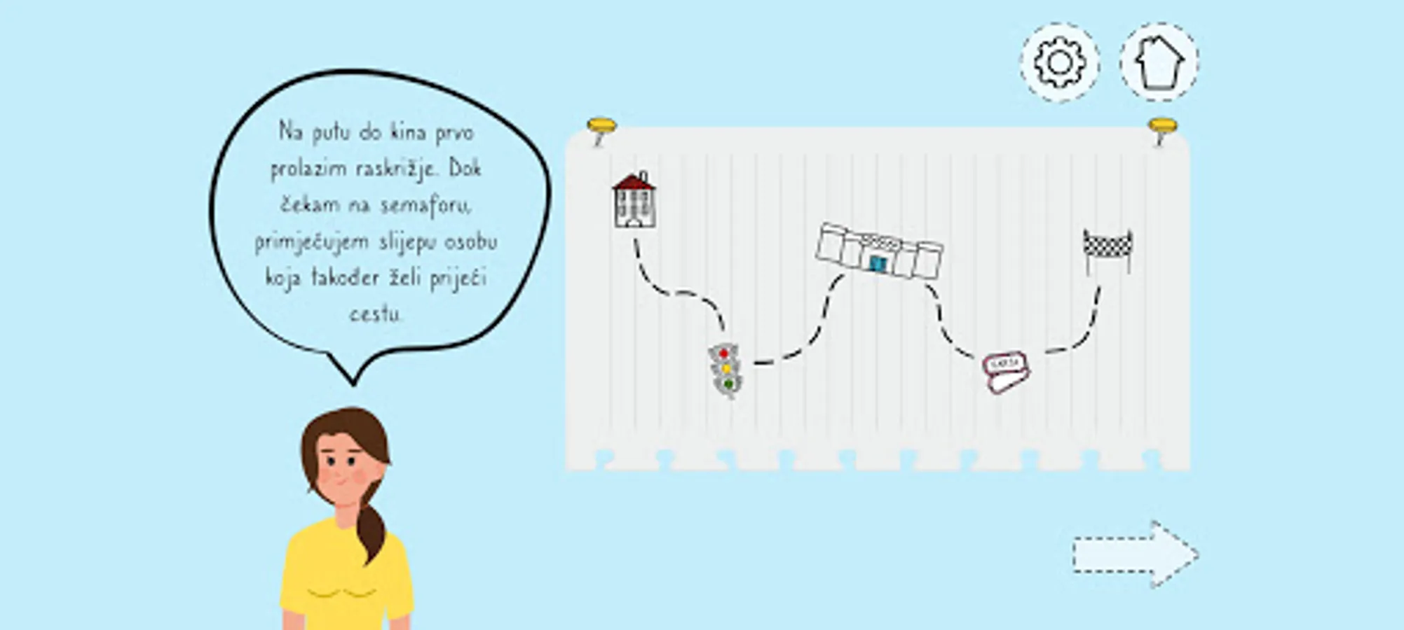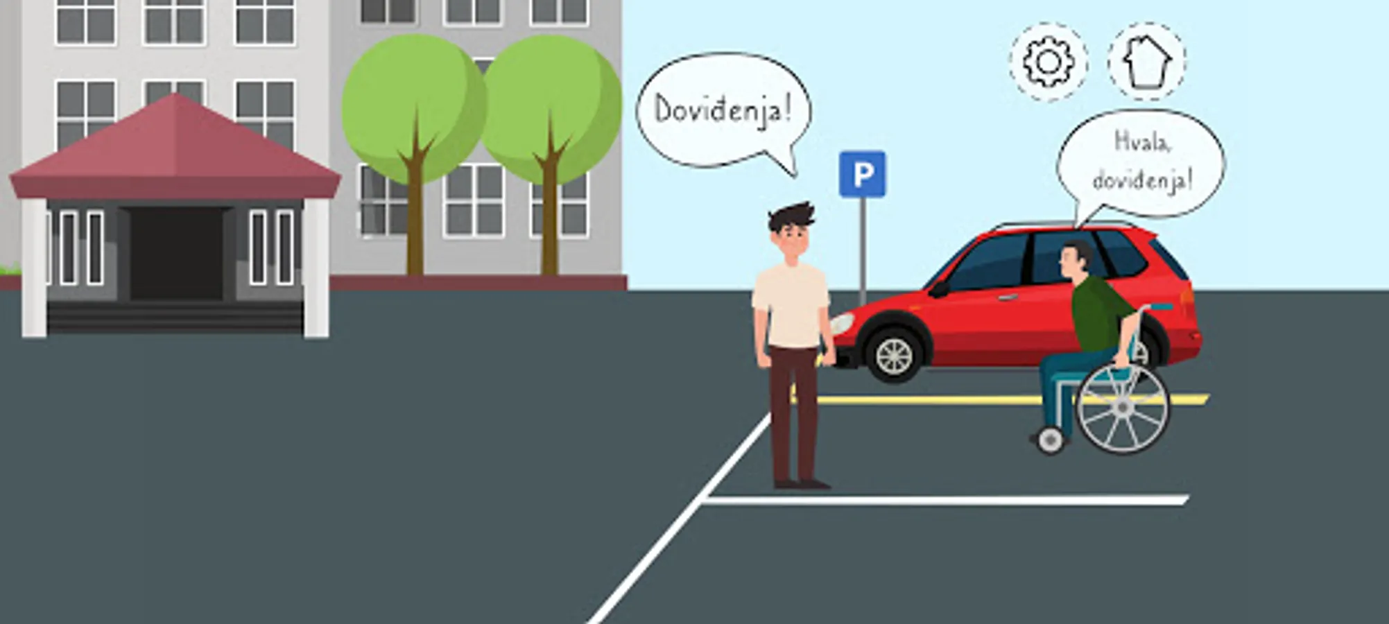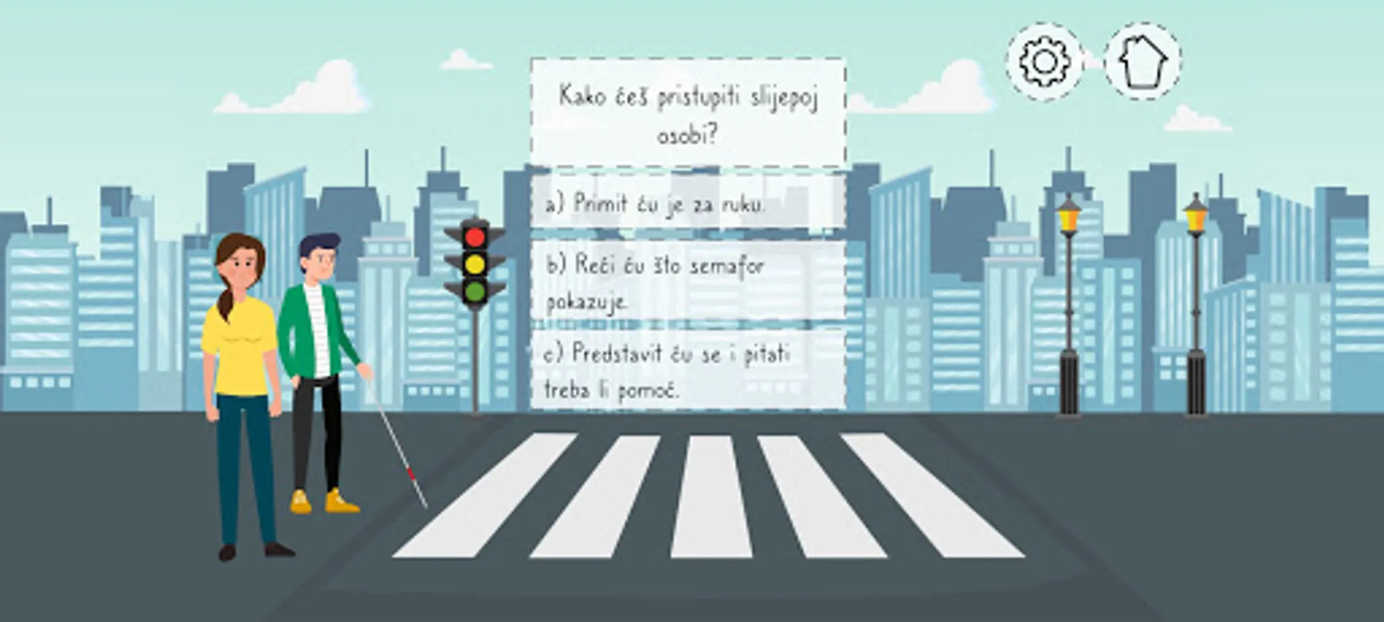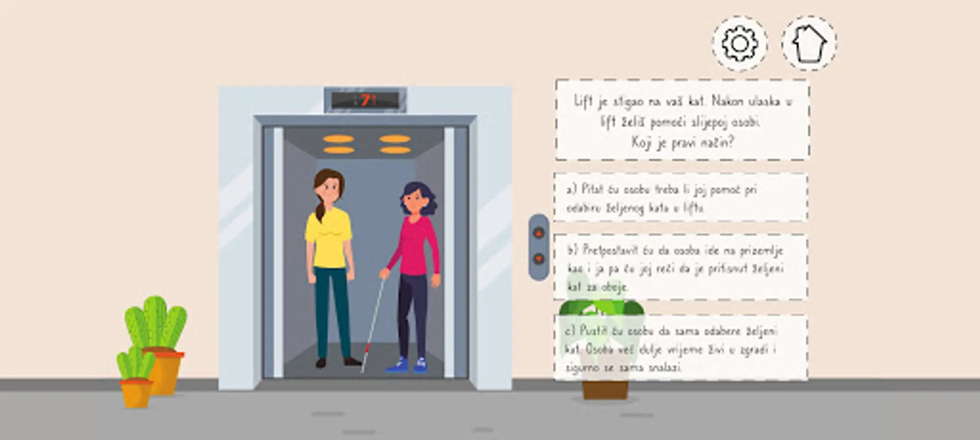 People often, wanting to help a person with a disability, put a person with a disability, but also themselves, in an awkward position due to the wrong approach, after which they feel bad and give up access to people with disabilities in any future situation. Therefore, the purpose of this application is to show on practical and life examples what is correct in this context. The application was developed in collaboration with associations whose members are people with different types of disabilities, and it covers various everyday situations (eg waiting at the station, entering the elevator, crossing intersections, parking, etc.) in which the need to initiate communication often arises . The application in an attractive way, with the choice of one of the two offered avatars, shows different everyday situations and in the form of a kind of quiz leads the user to the correct knowledge about access and forms of communication with people with disabilities. In addition, the application is also accessible, which means that it can be used by people with different types of disabilities, more precisely, certain adjustments are built in, such as the option to increase the screen (Zoom) and change the font. Also, the Web version of the application has a built-in screen reader simulator - Narration.