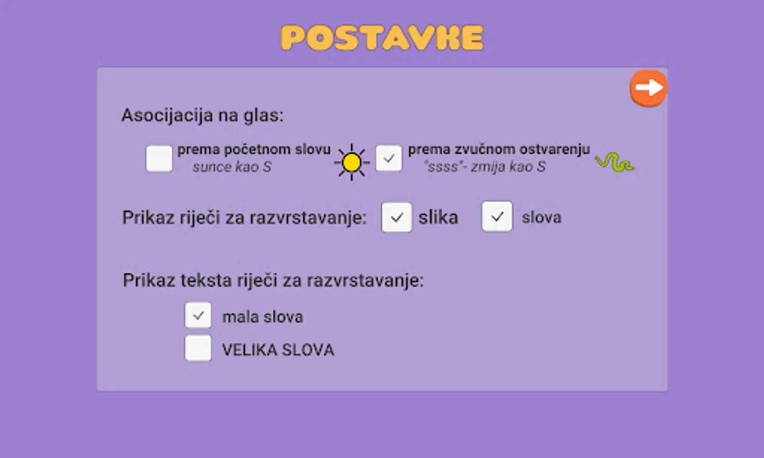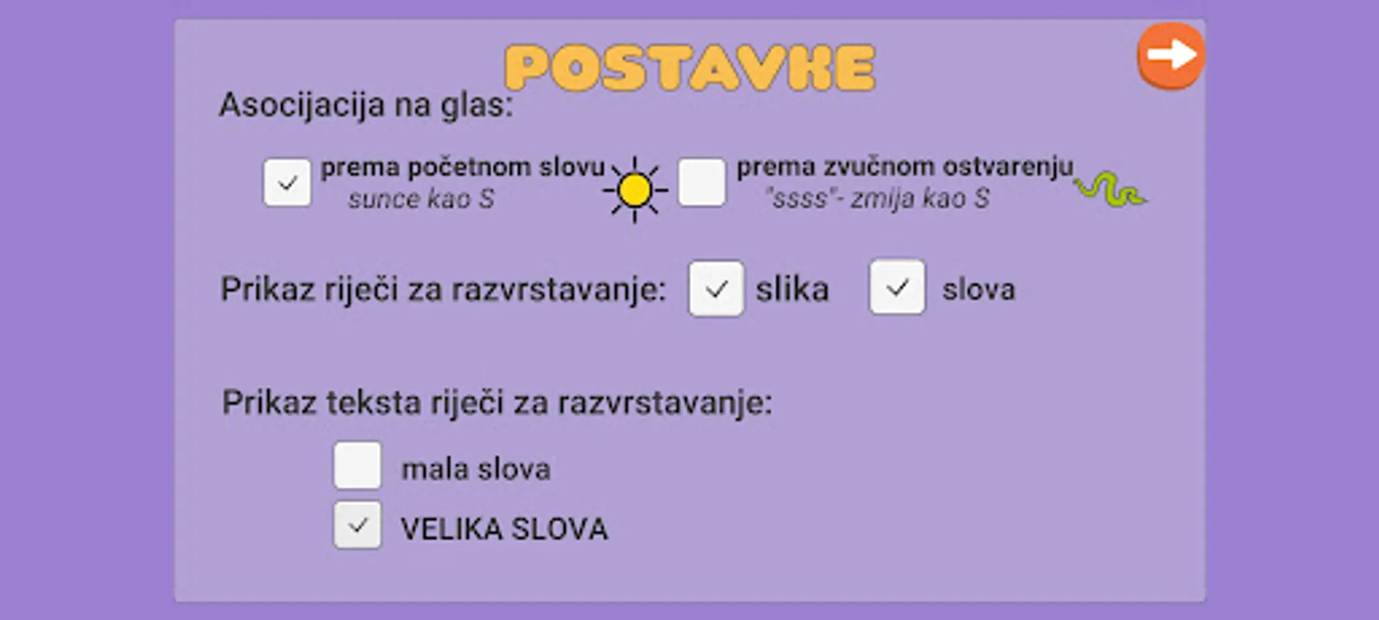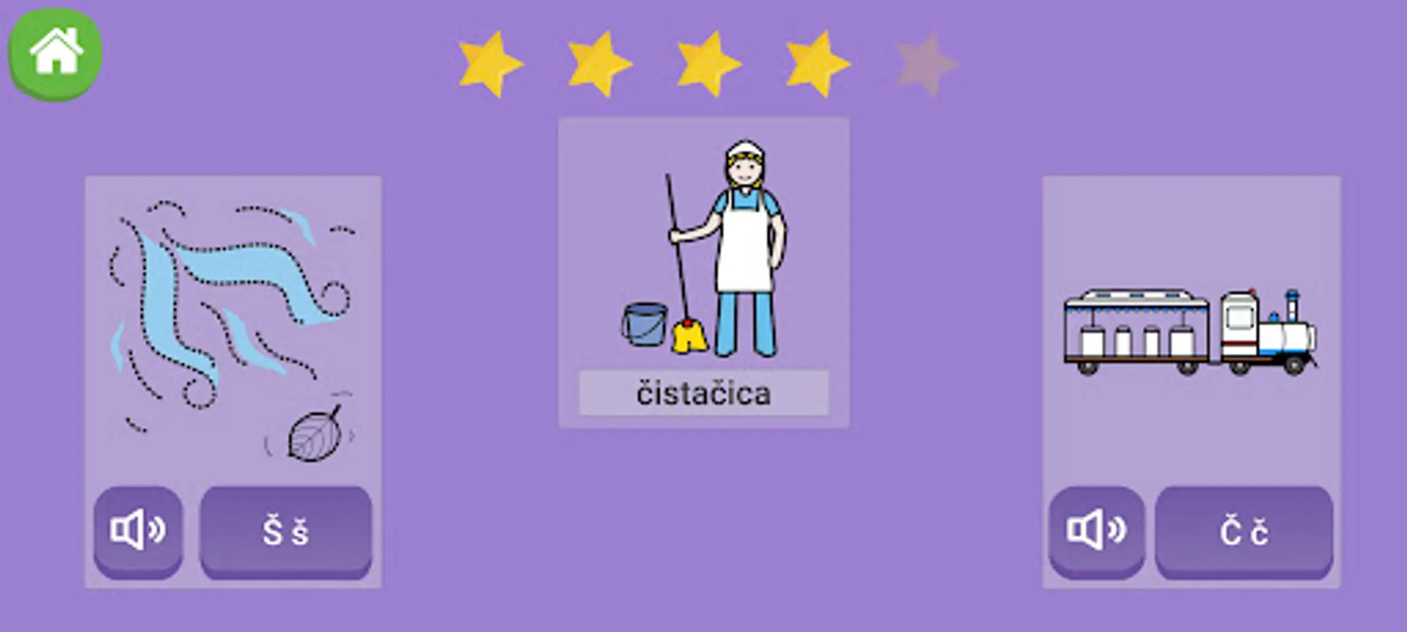 Before starting the game, personalize the settings according to the skill you want to practice. Choose the display method of the offered words (symbol, text or symbol with text), the position of the target sounds within the word (depending on the training phase) and enable/disable the option of word pronunciation and letter display. Now you are ready to start the game. Choose two voices that you want to practice distinguishing and start sorting. The current version of the application contains voices from a wider group of sigmatism (S, Z, C, Š, Ž, Č, Ć, Đ, DŽ).