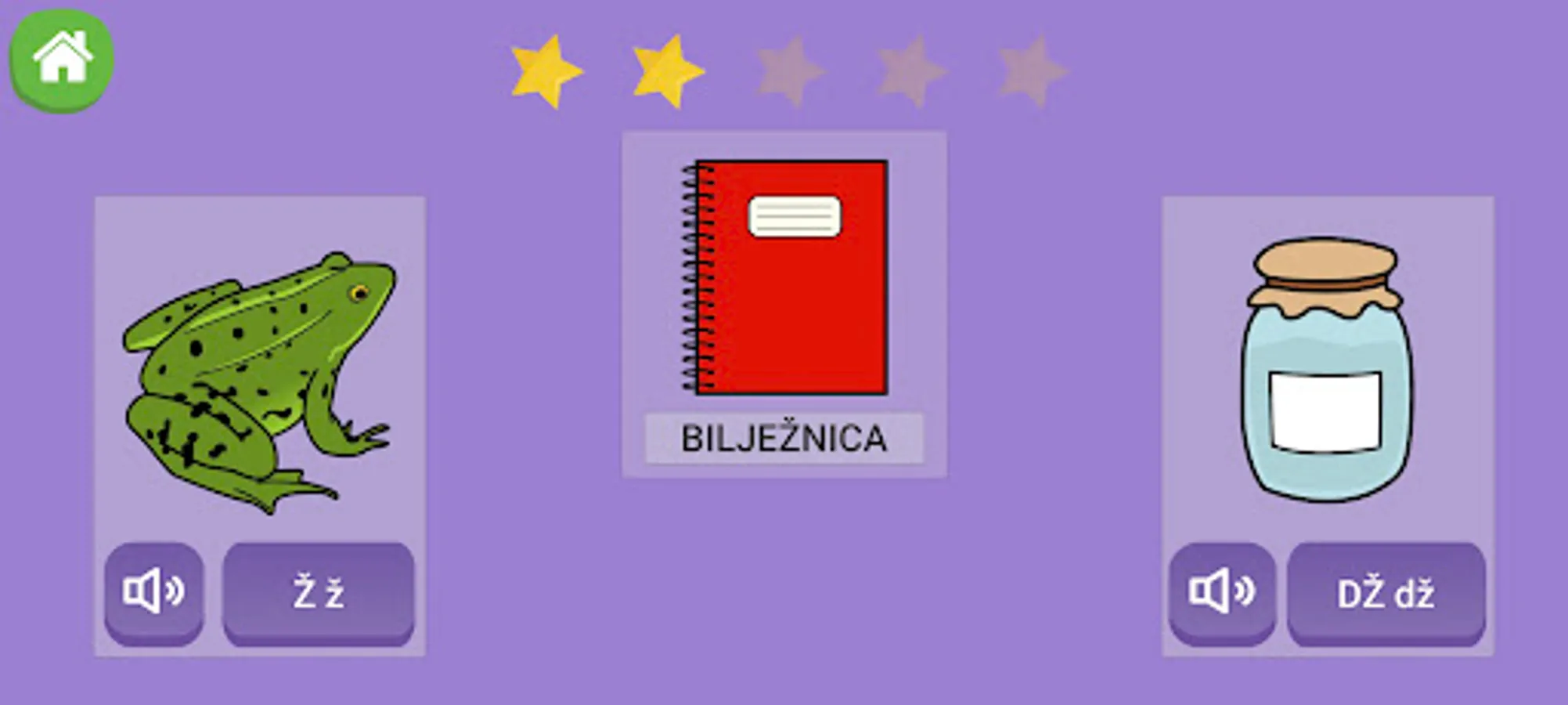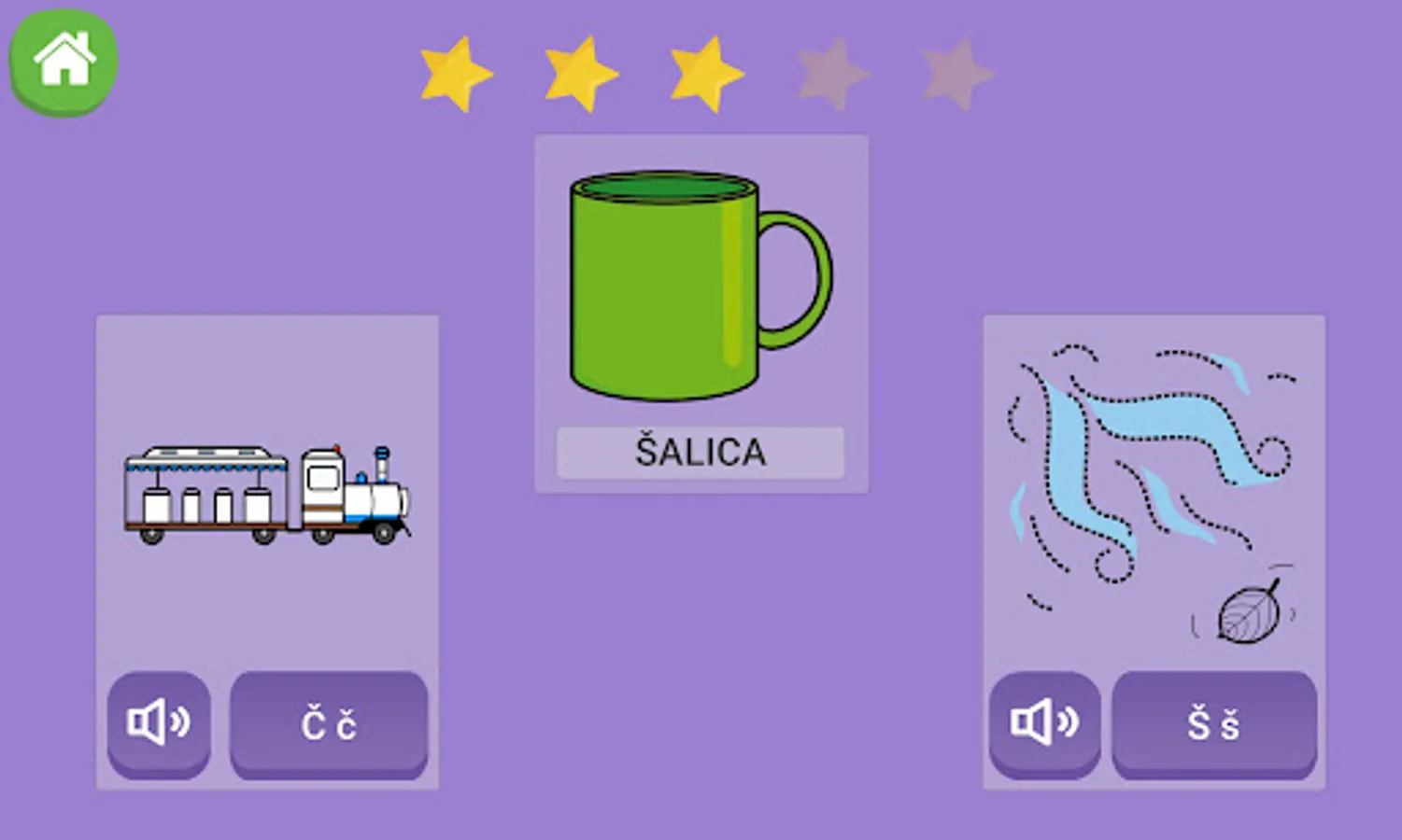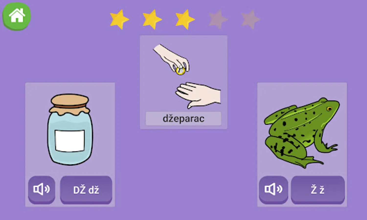 Before starting the game, personalize the settings according to the skill you want to practice. Choose the display method of the offered words (symbol, text or symbol with text), the position of the target sounds within the word (depending on the training phase) and enable/disable the option of word pronunciation and letter display. Now you are ready to start the game. Choose two voices that you want to practice distinguishing and start sorting. The current version of the application contains voices from a wider group of sigmatism (S, Z, C, Š, Ž, Č, Ć, Đ, DŽ).