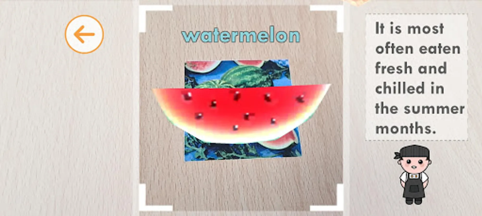There are two AR- based games which the users can play if their device supports AR services. Both games include scanning the AR markers, which can be created and printed with the application. Within the Learn game the user can scan the AR marker and find out interesting facts about the scanned ingredient. Within the Find game, the user has to find the ingredient that matches the one displayed at the top of the screen. When the correct AR marker for the ingredient is scanned, the 3D model of the ingredient appears on the marker.