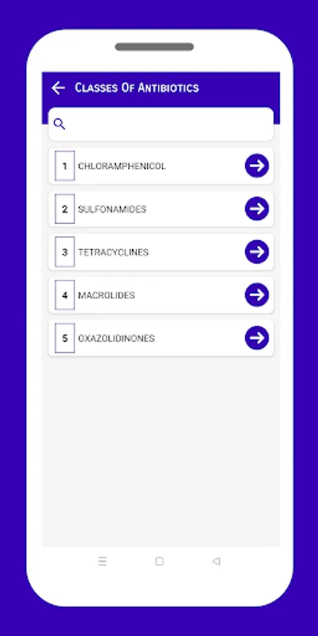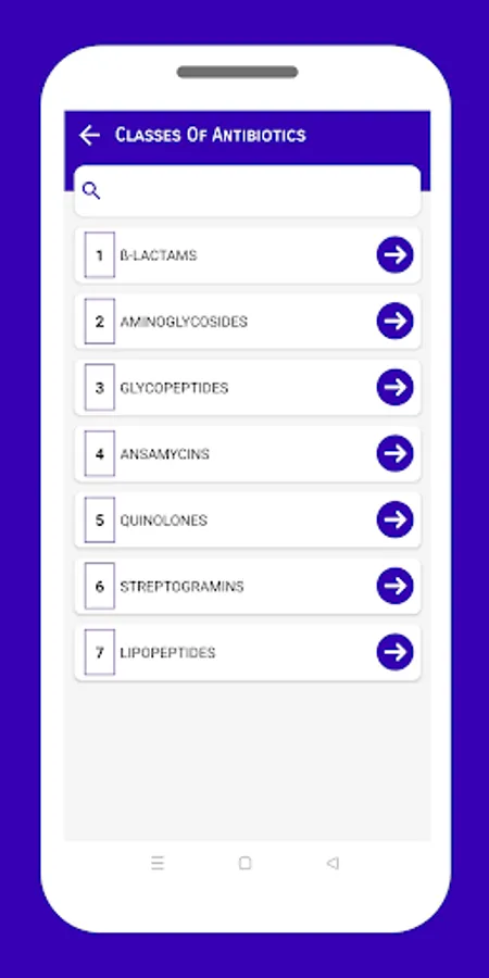 Classes of Antibiotics is an android application. It is very user friendly. Everyone can easily use it. Its use is very simple. When you will click on the icon of the application. Cover screen of application will display for 3 seconds. After 3 seconds it will automatically closed and a home screen will in front of you. This screen have two categories of antibiotics. You can choose any category by clicking. one. A list of antibiotics for each category will open. When you will click on any item of list.Corresponding explanation screen will open.Typing error may be occured. If any one find any error tell us by comment. We will soon remove this error. Thanks