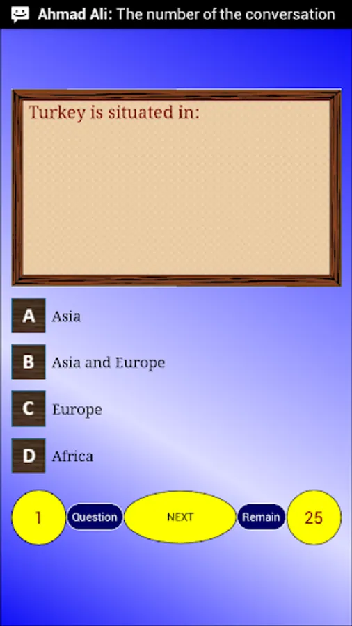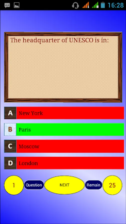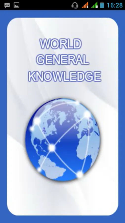 World general knowledge is an android application. It is very user friendly application. This application includes 13 quizes having 25 questions each. When user click on the icon of the application. A logo screen will be displayed for 3 seconds. After that home screen will be in front of user. This screen contain 13 quizes. when user click on any quiz button. Quiz will start. Each question consist of one question statement and 4 options. Choose the correct option. if your answer is correct you will get one mark else 0. After the quiz result will be displayed. If anyone does not choose any option, it will consider as wrong answer.