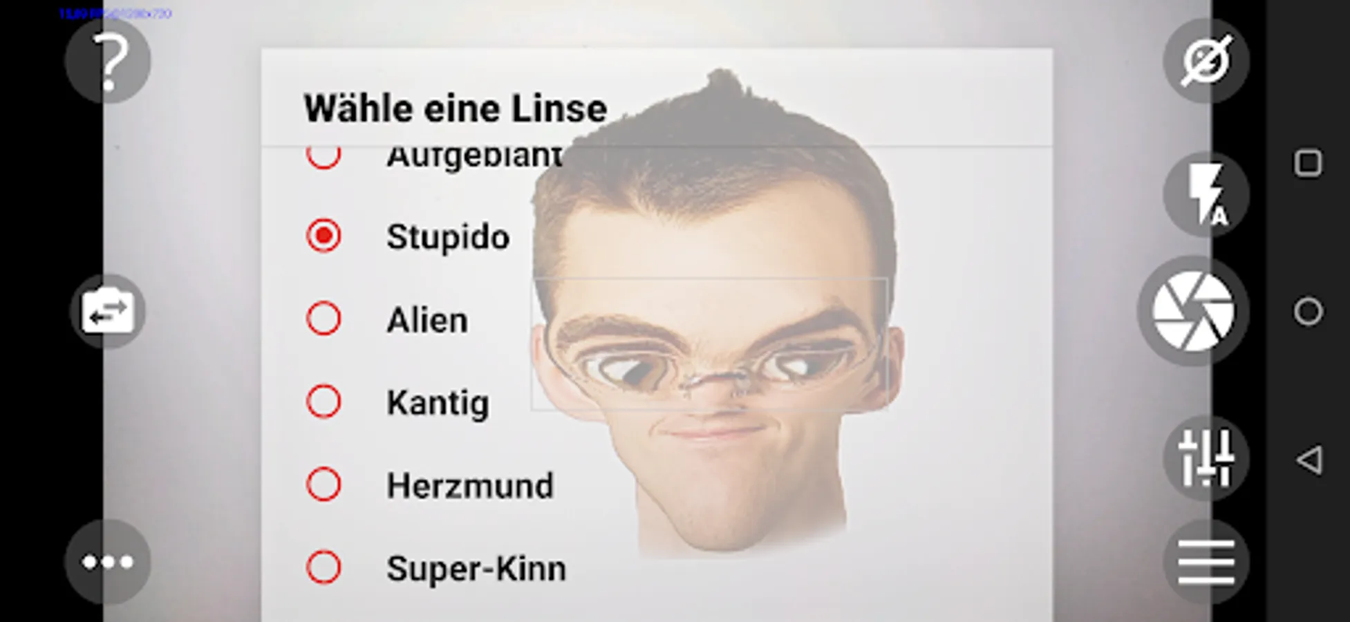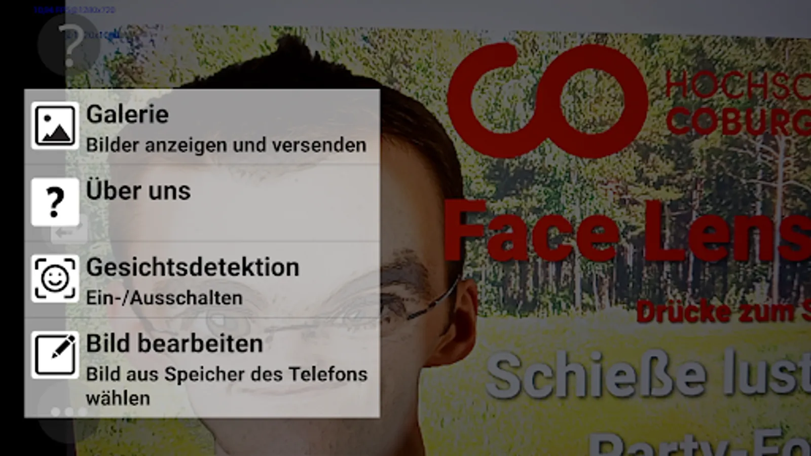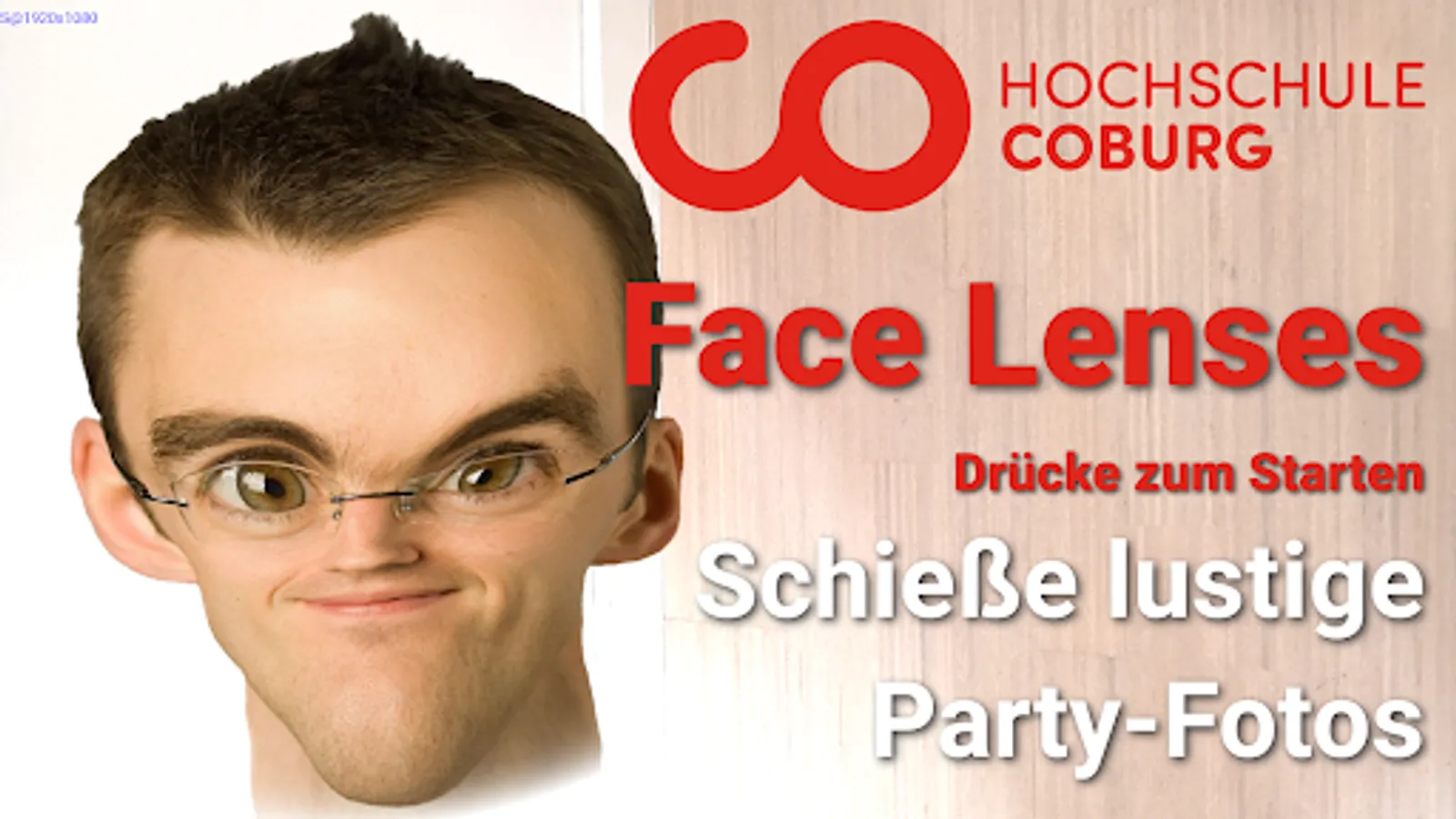 FaceLenses is being developed by students in the field of visual computing at the Coburg University of Applied Sciences. With FaceLenses you can take photos of your friends, with a selected effect for distorting the image being displayed live in the preview. Selfies are also possible if a front camera is available. The effects can be selected via a menu and can be varied using various parameters.