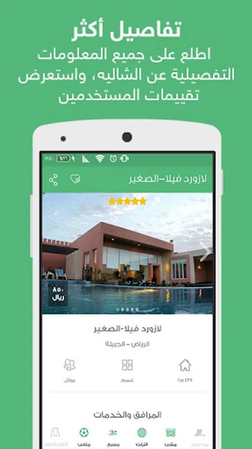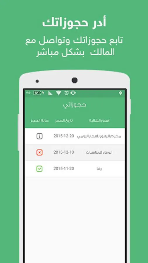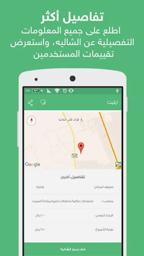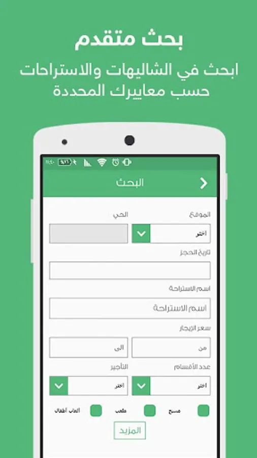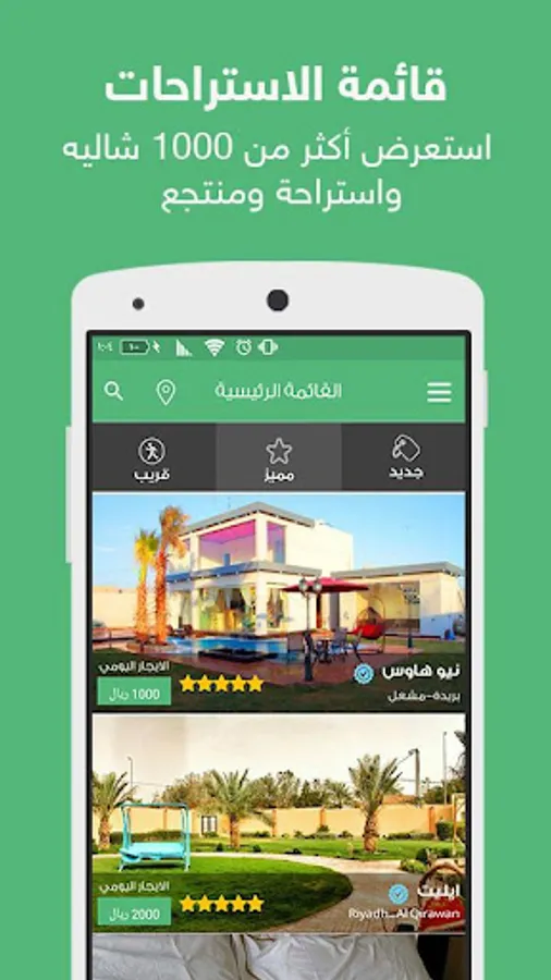 When you want to book cottages, motel, resort or camp may need to big effort includes online search sites, communicate directly with the owner or keeper may have to visit the desired area of research and the completion of the booking process, your problem and suffered a lot with a solution with the application Wind to book chalets, guest houses, resorts and camps because of the ease of the search for what suits you best among the large number of real estate without bothering to search in other ways. The application allows users to direct bookings for a number of chalets, as well as the possibility of payment via credit card or through a payment service in addition to the bank transfer. Can be found via the application on the chalets details in detail, such as space, images and facilities available in the property such as a swimming pool, playground, children's playgrounds, Foreign sessions and others can also be found on the site break or chalet or resort on the map with the possibility of sending and share it with others easily Alwatsab or the means of social communication. The application of wind on your property that has, where a user can add the application rest houses, chalets and resorts desired by the wish list to return them later, apply the Wind designed attractively assists in access to information easily, so having a quick lists help the tenant in the research process (such as Featured, near, newly added), as well as a search function according to standards specified by the user, such as the city and the neighborhood or chalet name.