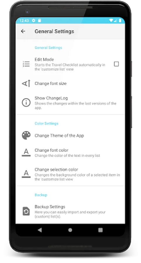 The PRO version of the app allows you to have unlimited number of lists. For instance for camping, weekend trips, business trips and more. It is also possible to import customized lists in any text format (separated by line breaks). Additionally you can also share your lists with your friends. If they also own the TravelChecklist PRO, they can easily import the list again.