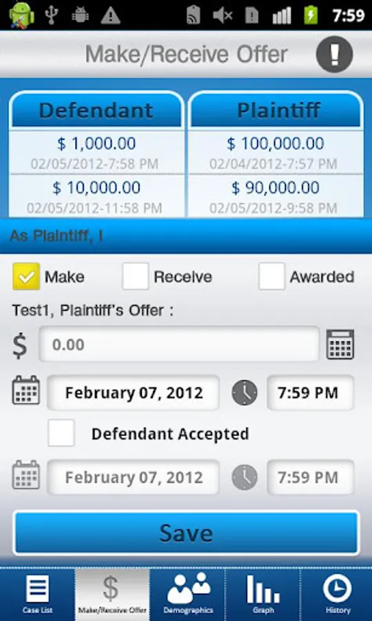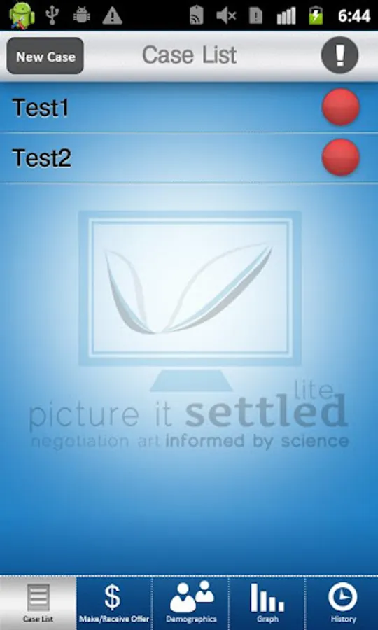 Some of that intelligence has been made available in this free app. Picture It Settled™ Lite tracks the dollar moves in negotiation. But, perhaps more importantly, it also tracks the time interval between offers. The app then takes that offer history and extrapolates it out in both dollars and time to help the parties picture whether and when they might reach a deal. The actual offers are connected by solid lines and the extrapolations are dotted.