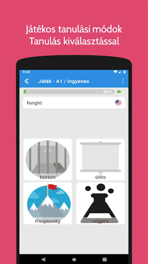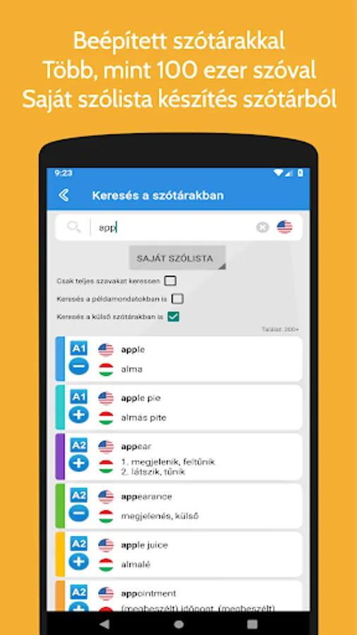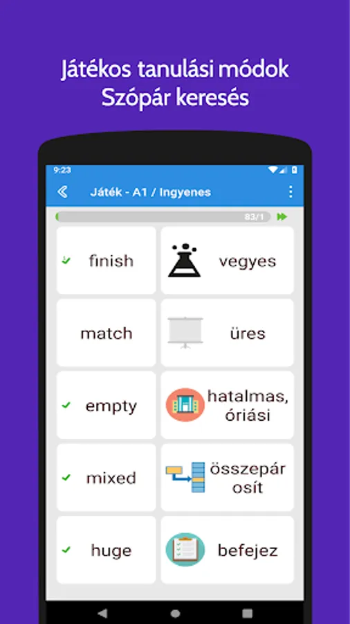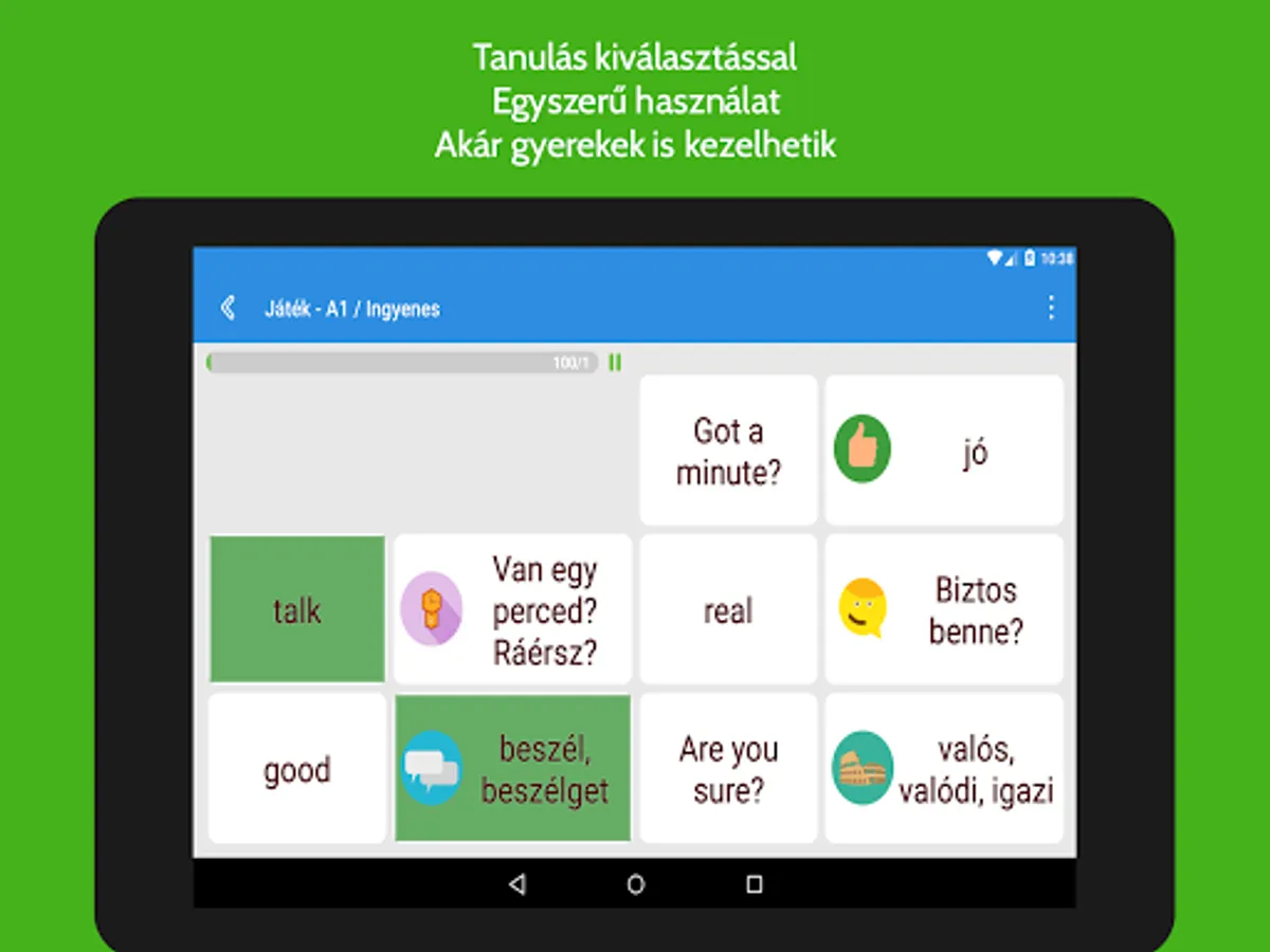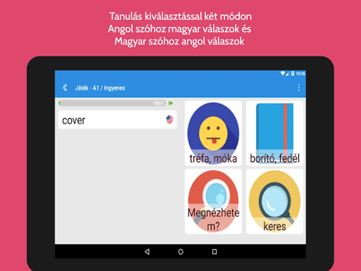 The program is noticeably helpful in the most tiring, lengthy part of language learning! Currently supported English language exam levels: A1 (1400 words), A2 (1500 words), B1 (1800 words), B2 (1400 words), economic terms (1300 words), tourism terms (1000 words).