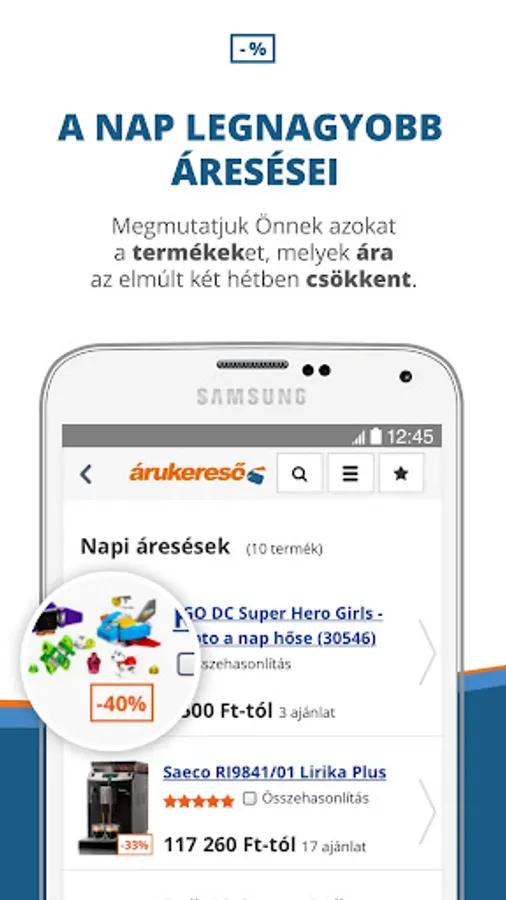 Browse through the categories, choose the criteria that are important to you, or use the barcode recognition feature to find the best price and best-value vendor anywhere, anytime. The decision of the mobile application of Árukearch.hu is also supported by user reviews, detailed product descriptions, shop information and picture gallery. It is possible to set up a price monitoring service through the application, so you can receive an email notification if the price of the product you are looking for falls below the indicated amount.