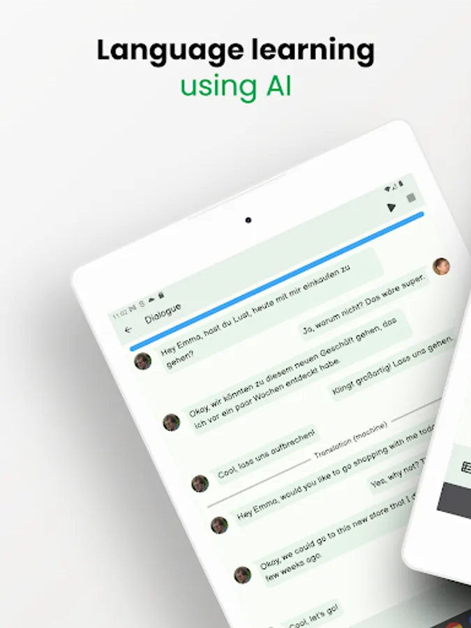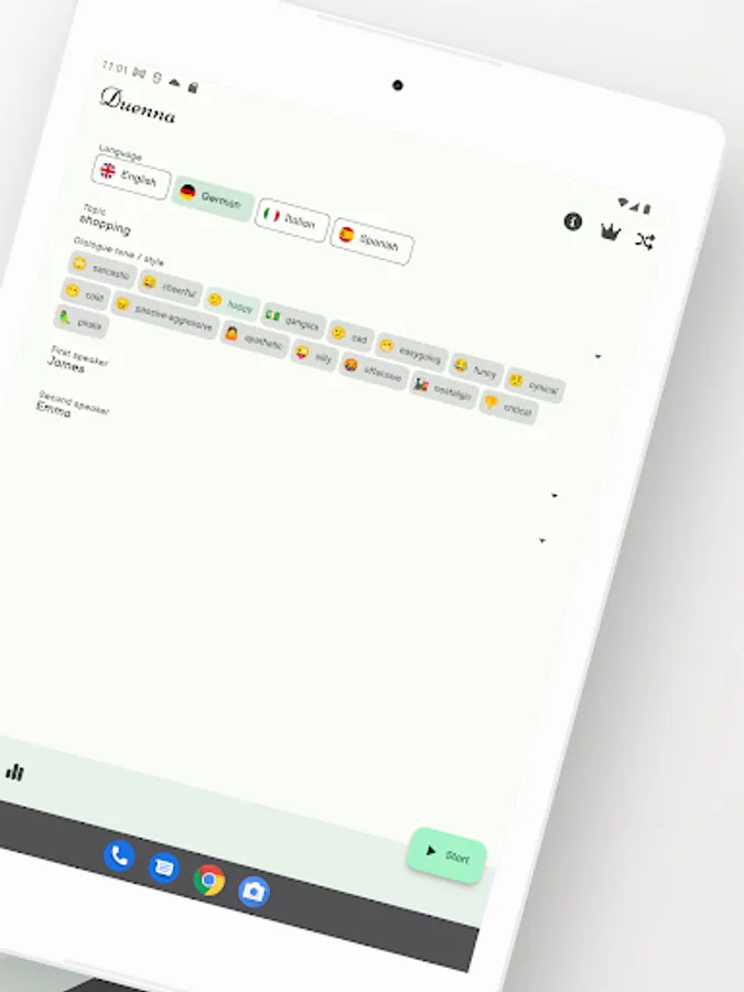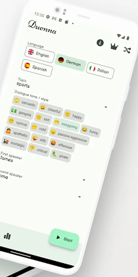 Duenna AI is an artificial intelligence (AI) based language learning application that allows you to learn your chosen language through realistic, grammatically correct, sophisticated AI-generated dialogues. The dialogues are generated by the AI based on the given conditions: