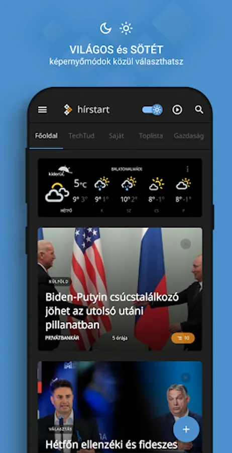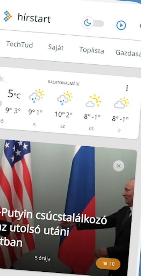 All news has a place here! The latest news in one place on all popular topics: public life, foreign policy, domestic policy, economy, lifestyle, sports, football, form-1, science, infotech, mobile tech, music, film, culture, weather, tabloid and star news and everything that interests readers interested in. It's like an RSS reader with lots of pre-wired feeds. Our readers do not miss the weather forecast either. The Hírstart application remains free and ad-free.