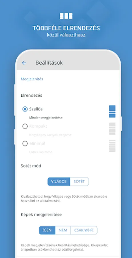 • Adjustable appearances: airy, compact, minimal, image on/off, dark mode