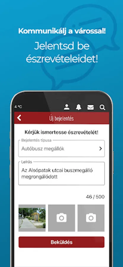 • Municipal reporter: You have the opportunity to report irregularities detected in the settlement via mobile phone and to follow up on the reports. The exact location of the announcement can be made based on GPS coordinates or by entering an address. Reports are sent directly to the city's solving group based on the type of report, where processing begins.