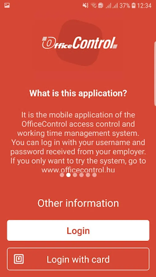 It is the mobile application of the OfficeControl access control and working time management system. You can log in with your username and password received from your employer. If you only want to try the system, go to www.officecontrol.eu