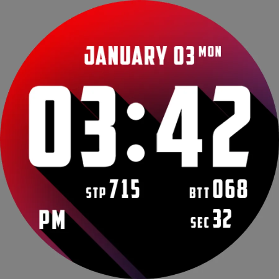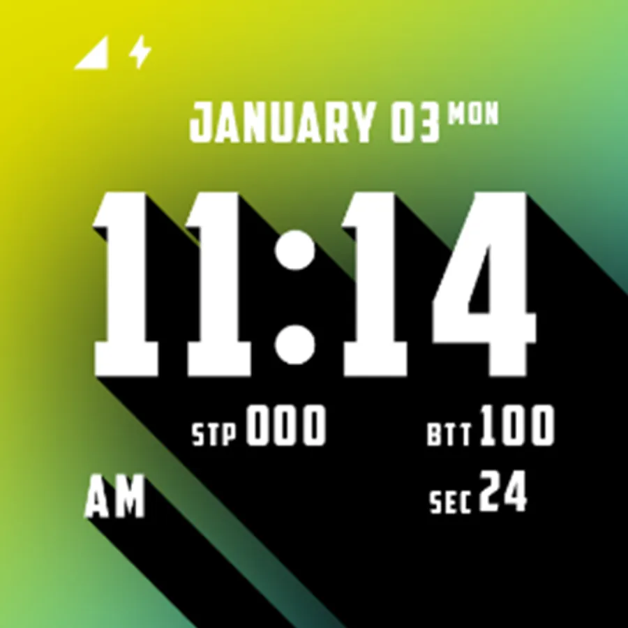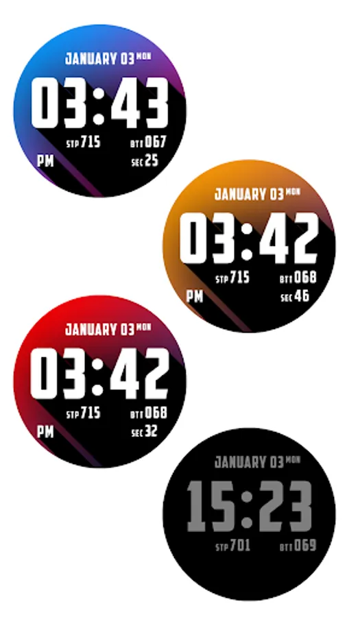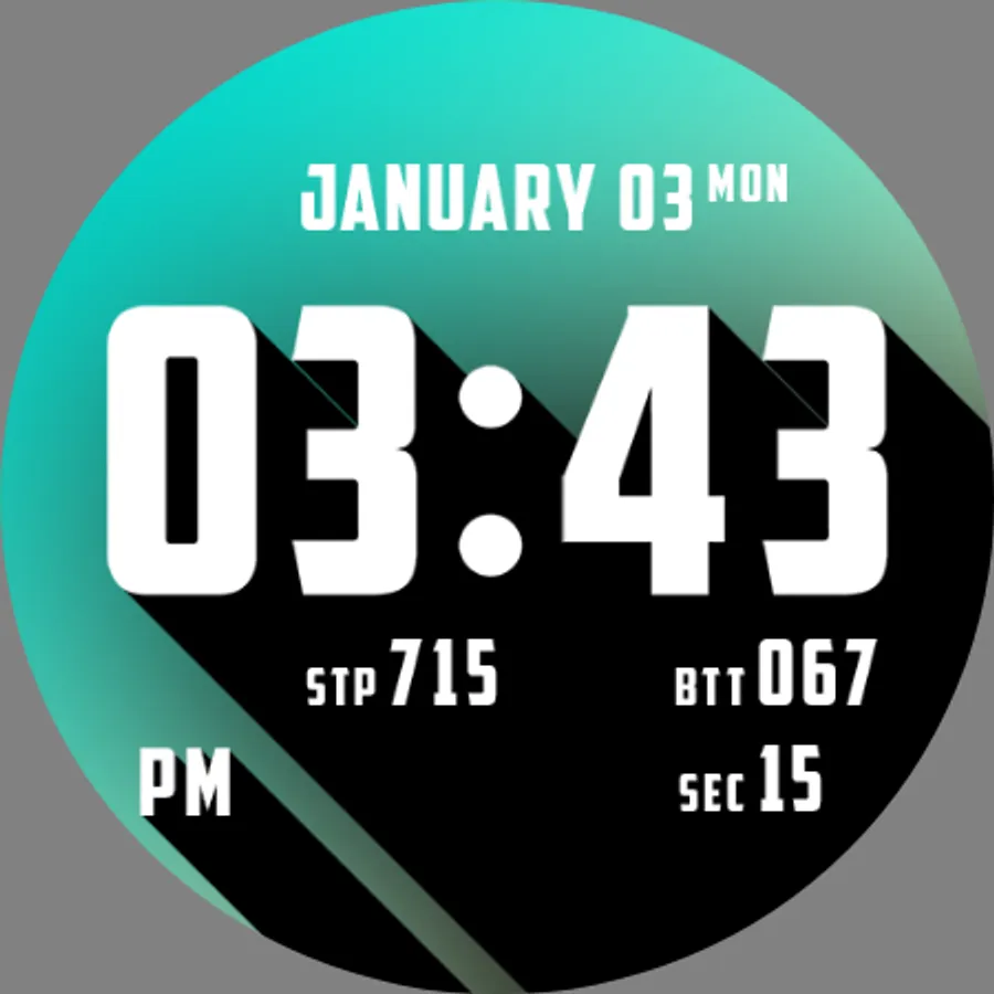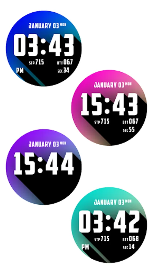 "Here’s one for typography and gradient lovers out there. Blokk puts the time front and center and has four additional slots to display watch status info or activity info. We particularly like the choice of gradients. While the text will remain white with a black border and sharp shadow cast from left to right, you can choose between several color combinations or a specific option that changes based on the time of day."