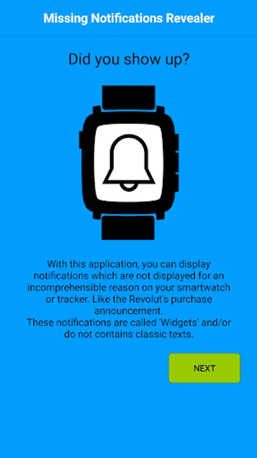 With this application, you can display notifications which are not displayed for an incomprehensible reason on your smartwatch or tracker. Like the Revolut's purchase announcement.