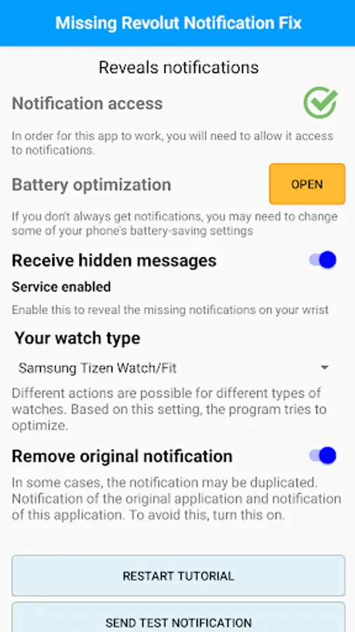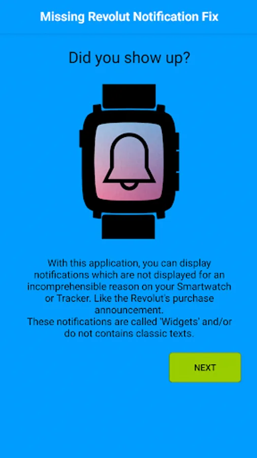 With this application, you can display notifications which are not displayed for an incomprehensible reason on your smartwatch or tracker. Like the Revolut's purchase announcement.