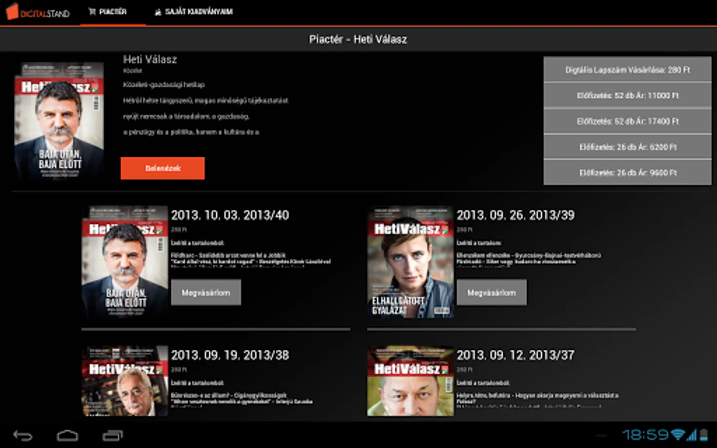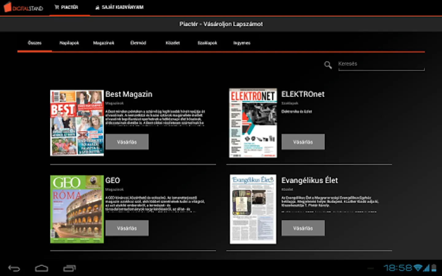 The Digitalstand application is a further developed version of Hungary's leading digital newspaper reading system. The free downloadable app provides convenient, quick access and reading access to digital publications from magazine publishers. Digitalstand's ever-expanding offer includes, but is not limited to, Nemzeti Sport, Nők Lapja, Magyar Hírlap, Népszava, Hungarian Cuisine, World Economy, Tax World, PC World, Magyar Nemzet, A Globe, Home Culture, Garden Calendar, Fanny, Magyar Hang, Mandiner and many more publication. The application supports login by registering on the Digitalstand.hu website.
