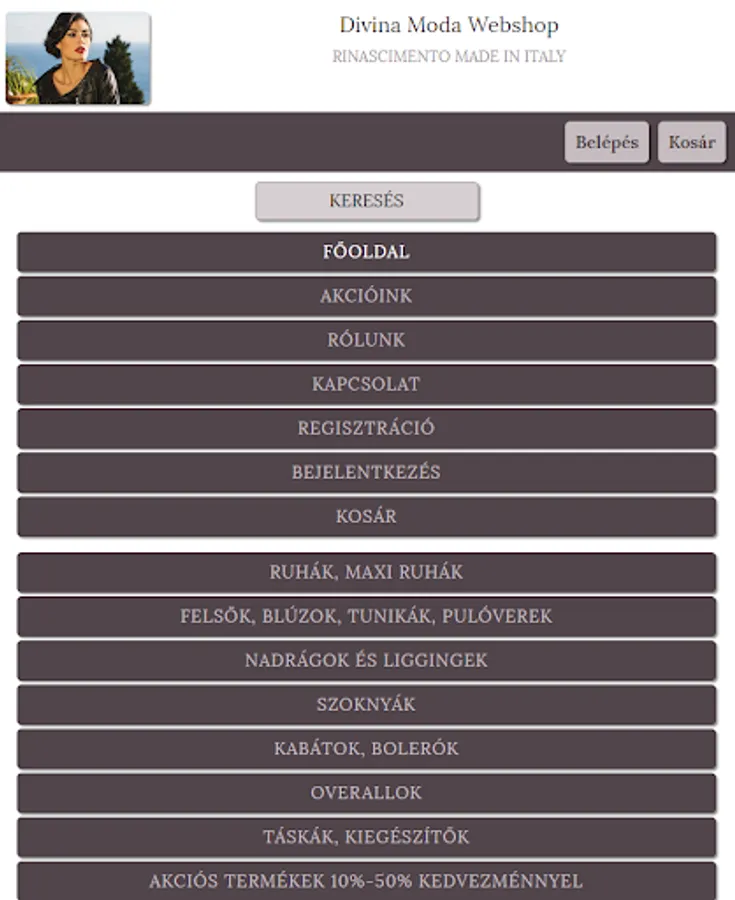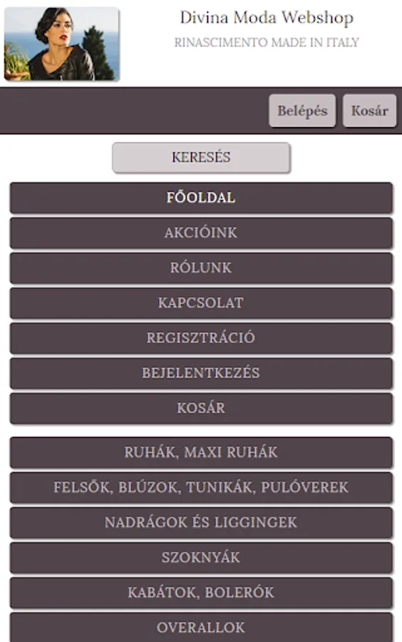 Stylish Italian women's clothing webshop. Rinascimento and other high-end brands from Italy and France. And legging pants, skirts, jackets, dresses, tops and more high-quality clothing products.