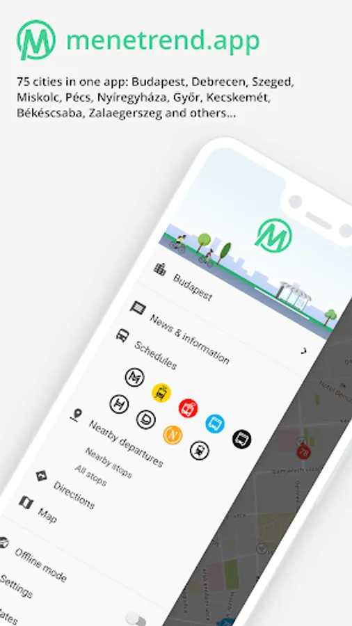 Public transit schedule and route planner application for 75 Hungarian cities: Ajka, Baja, Balassagyarmat, Balatonfüred, Balatonfűzfő, Balmazújváros, Bátaszék, Bátonyterenye, Békés, Békéscsaba, Berettyóújfalu, Bonyhád, Budapest, Csongrád, Csurgó, Debrecen, Dunaújváros, Eger, Ercsi, Esztergom, Fonyód, Gödöllő, Gyöngyös, Győr, Gyula, Hajdúszoboszló, Hódmezővásárhely, Jászberény, Kaposvár, Karcag, Kazincbarcika, Kecskemét, Keszthely, Komárom, Komló, Körmend, Lenti, Makó, Mezőberény, Mezőtúr, Miskolc, Mohács, Mórahalom, Mosonmagyaróvár, Nagyatád, Nagykanizsa, Nyíregyháza, Orosháza, Oroszlány, Ózd, Pápa, Pécs, Püspökladány, Salgótarján, Siklós, Siófok, Sopron, Szeged, Székesfehérvár, Szekszárd, Szentes, Szigetvár, Szolnok, Szombathely, Tamási, Tata, Tatabánya, Tiszafüred, Tiszaújváros, Újszász, Vác, Várpalota, Veszprém and Zalaegerszeg.