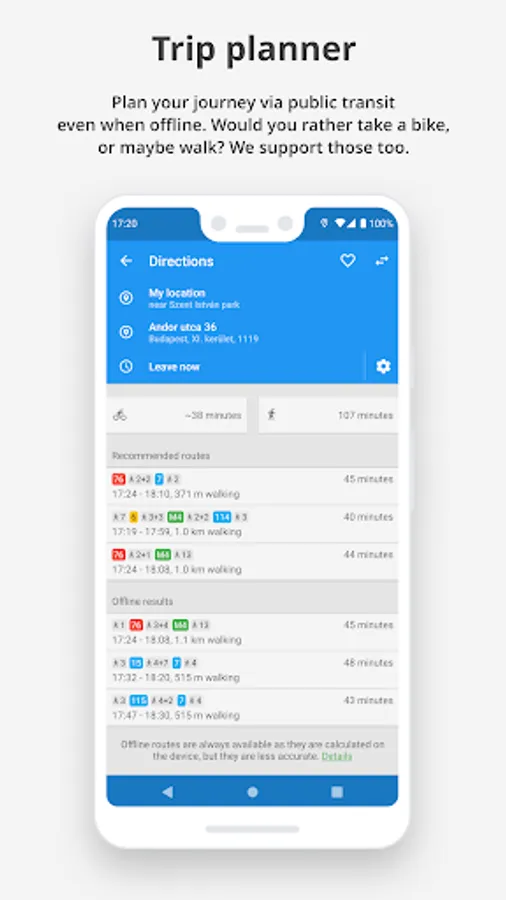 Street names, district names, and offline map data are based on OpenStreetMap. The publisher makes all commercially reasonable efforts to make sure the data displayed inside the application is accurate, however, due to the complexity of transit systems, the data might not always be fully accurate. The publisher takes no responsibility for the availability and fitness of the data, or damages caused by the use of the application. If possible, verify your trip using official information boards and service announcements before traveling.