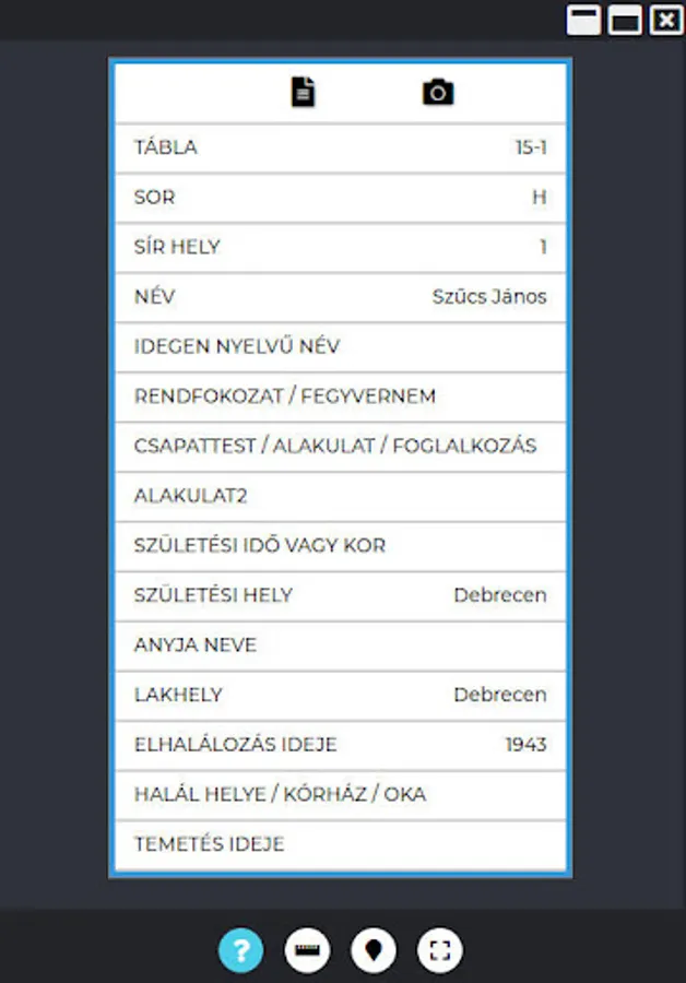 Click the View Datasheet or View Image icon at the top of the list to view the datasheet and photo. Each deceased has a datasheet and each grave has a photograph, so the same grave will be shown the same photograph. Click on the photo to enlarge it and move it with the mouse in the window.