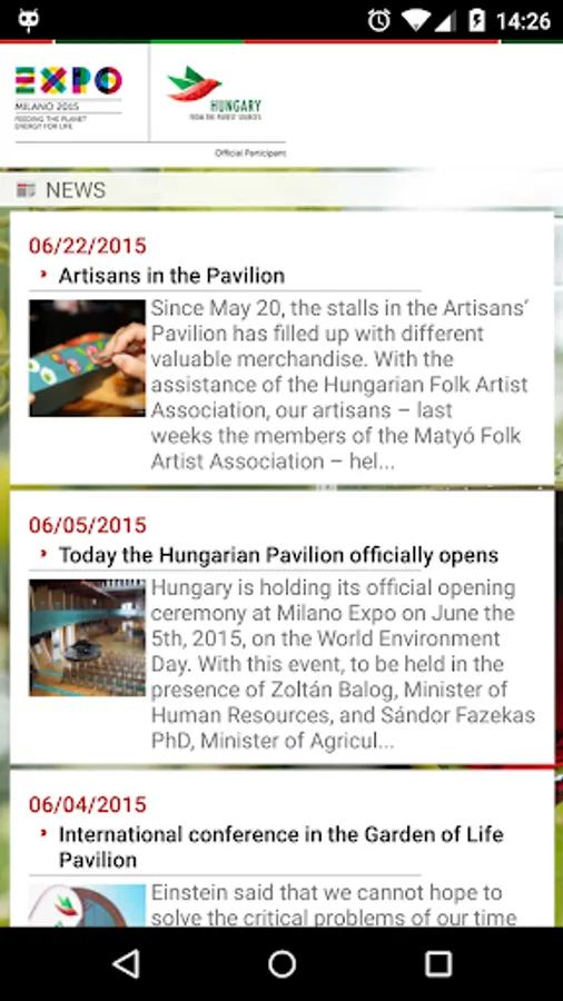 Discover the tastes and sounds of Hungary at the 2015 Universal Exposition hosted by Milan. Download the Expo Milano application to keep yourself updated on the events set in the Hungarian pavilion, and also to get latest news regarding the Garden of Life pavilion of Hungary. The app will also provide you with the map of the Expo, with which you can navigate between the booths easily.