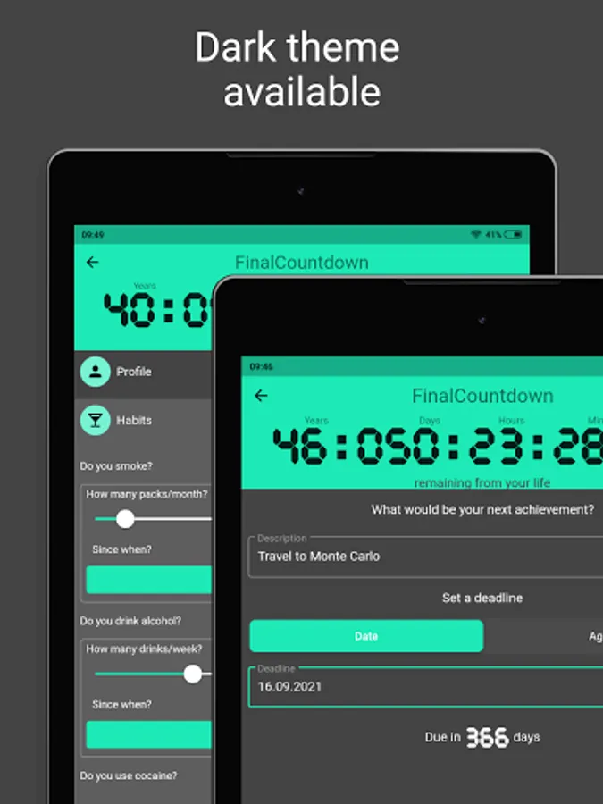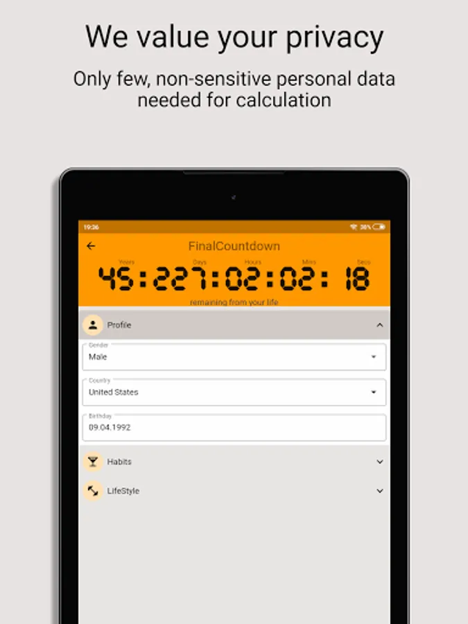 The FinalCountdown App calculates an estimate of your life expectancy based on a combination of official WHO and UN data, scientific researches, your unique habits and lifestyle. But your death date is just the beginning! It’s just a number to give you the motivation you need and send you in the right direction and accomplish your dreams.