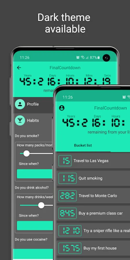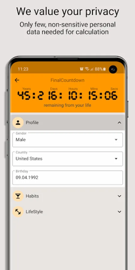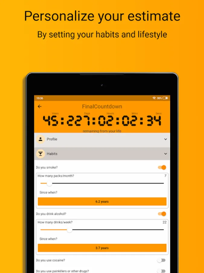 • Set your demographics, your healthy and unhealthy habits and let the app calculate your death date.