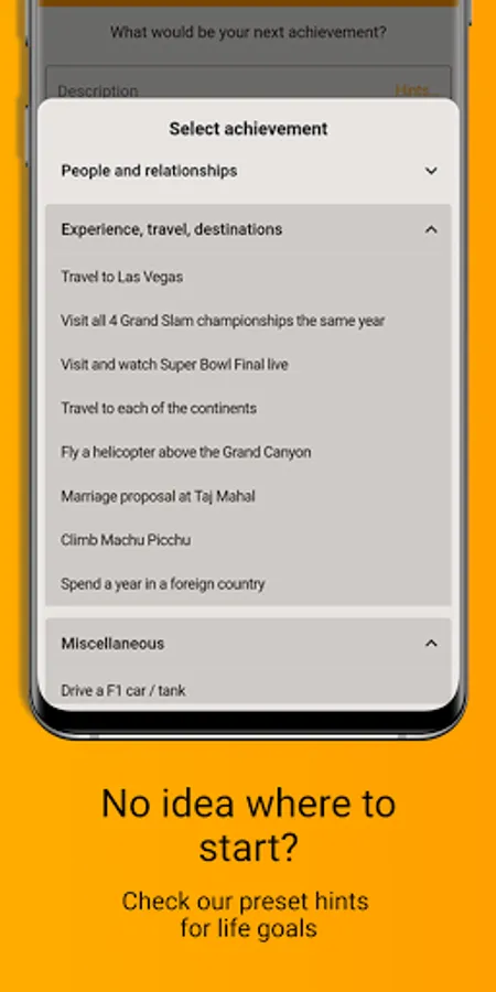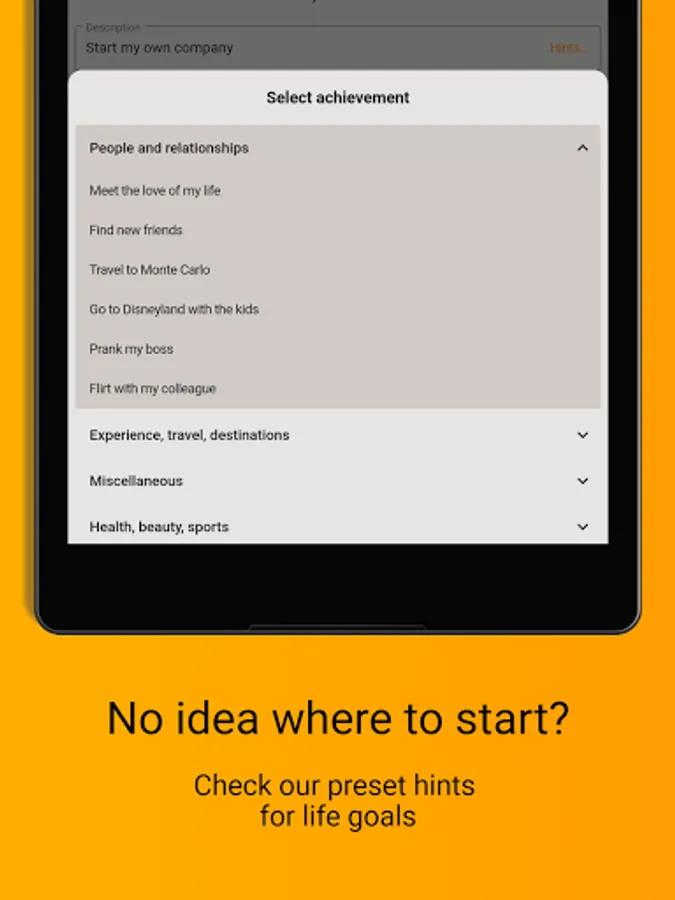 With our bucket list maker and goal management system you can set your short- and long-term life goals accompanied by countdowns, so you can easily keep track of them.
