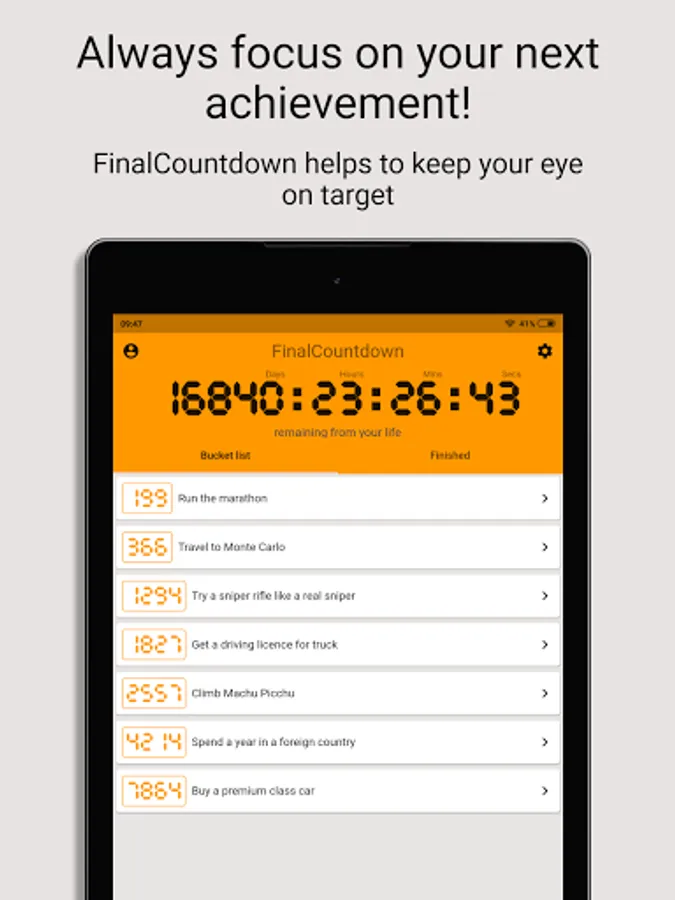 Set your life on the right track and gather new experiences by completing your checklist with the FinalCountdown app!
